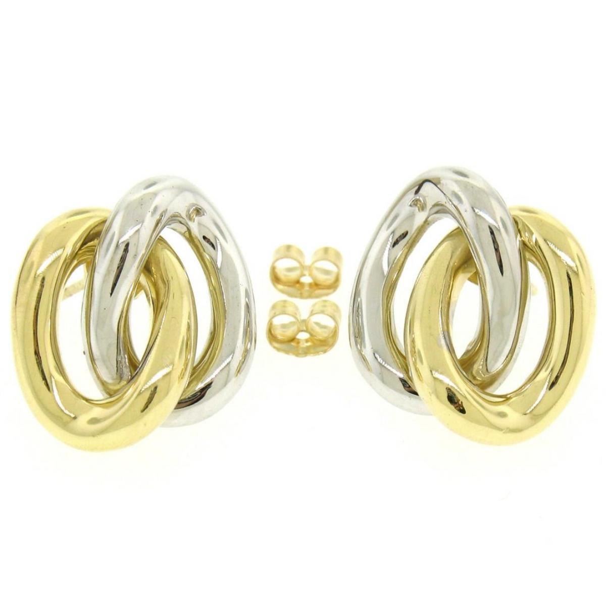 One 18K Two Tone Gold Stationary Dual Interlocking Oval Knot Stud Post Earrings 8.6g. Item Details: Material: Solid 18K Yellow & White Gold, Weight: 8.6 Grams, Backing: Post backings w/ Butterfly closures, Width: 17.30mm, Height: 16.70mm, Thickness: 9.02mm projection off the ear, Condition: Like New!