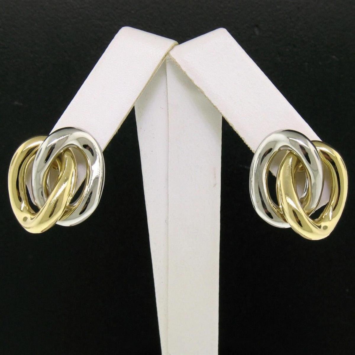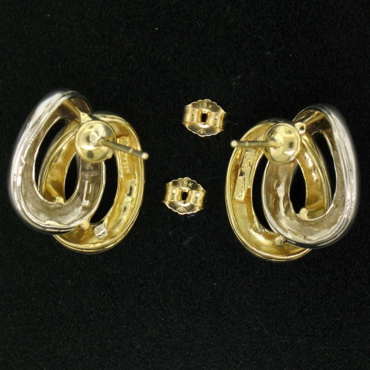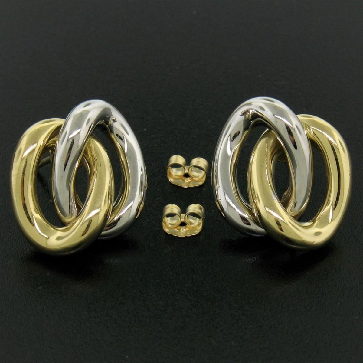 One Pair 18K Two Tone Gold Stationary Dual Interlocking Oval Knot Stud Post Earrings 8.6g. Item Details: Material: Solid 18K Yellow & White Gold, Weight: 8.6 Grams, Backing: Post backings w/ Butterfly closures, Width: 17.30mm, Height: 16.70mm, Thickness: 9.02mm projection off the ear, Condition: Like New!