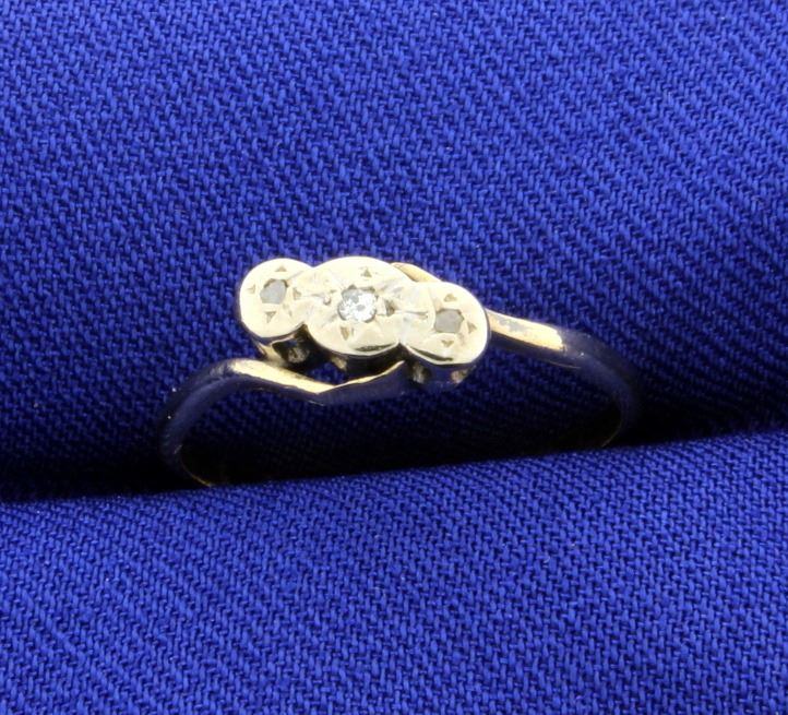 The ring is 18K yellow gold with platinum head and contains three 1pt diamonds. Size 5 1/2 1.6g