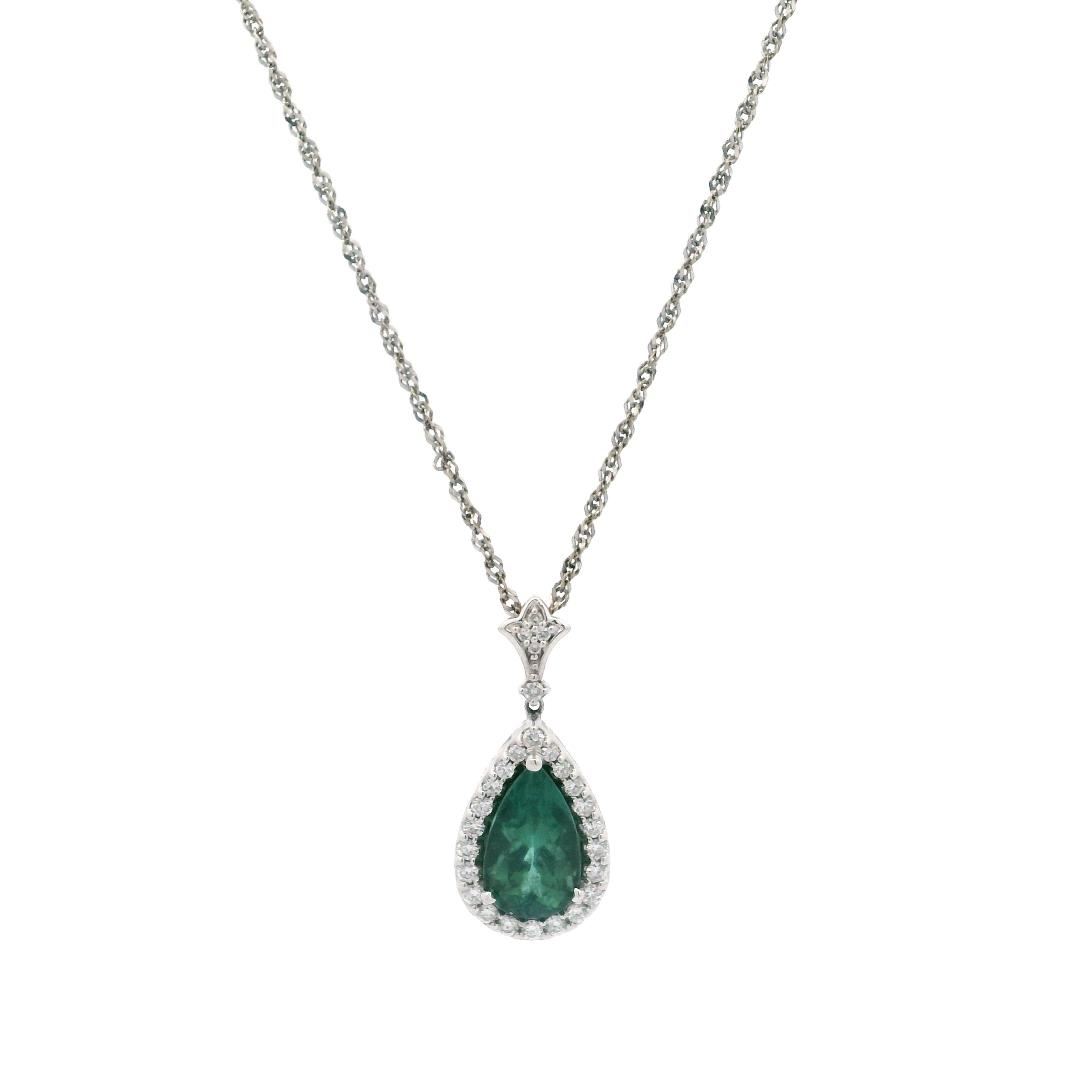 An 18KT white gold designer (Eichhorn) pendant featuring a 4.37ct pear-shaped blue-green tourmaline. Surrounded by 0.50ct of round brilliant cut diamonds, graded VS-1 to SI-1 clarity, set in a halo design. The 16-inch chain is crafted from 14KT white gold.