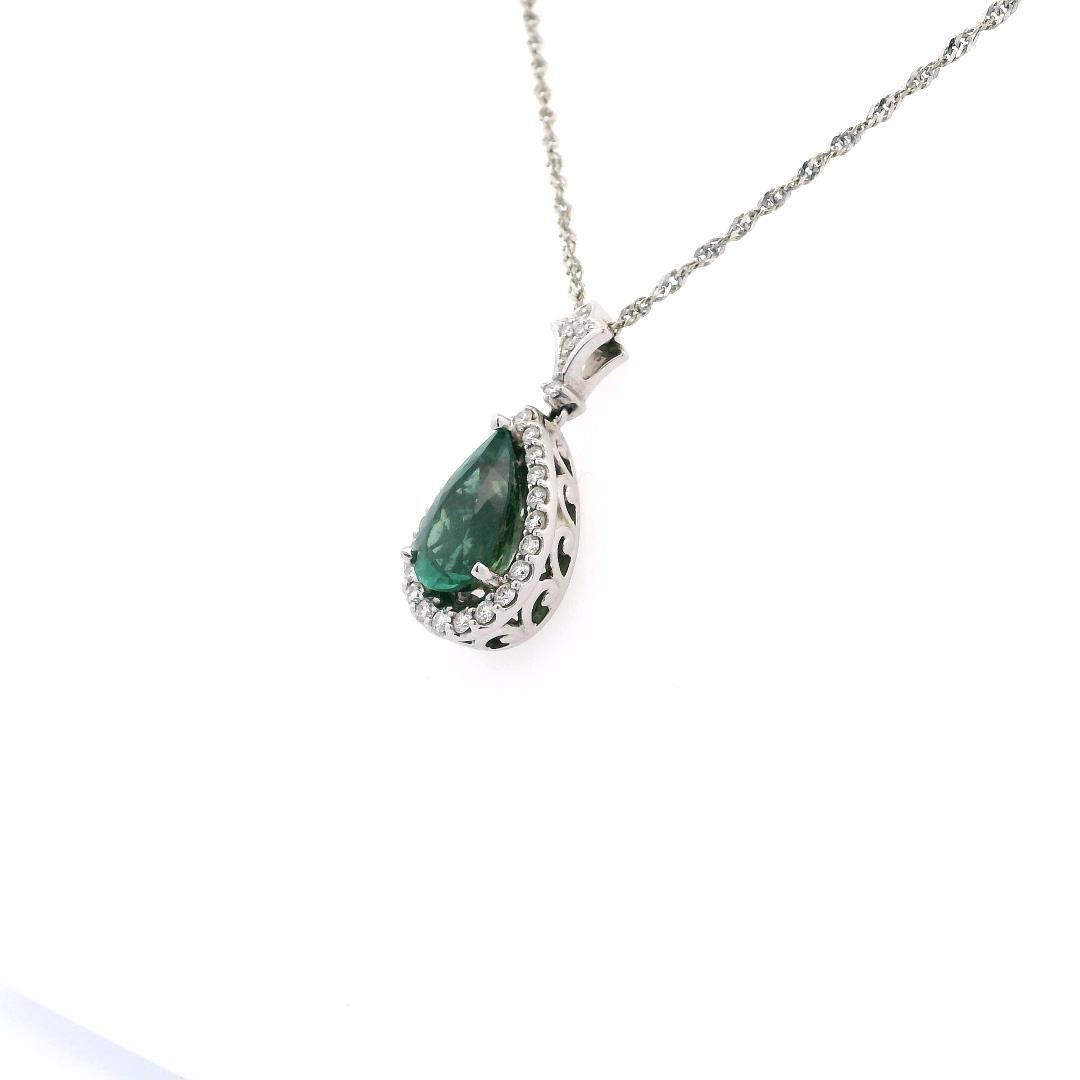 An 18KT white gold designer (Eichhorn) pendant featuring a 4.37ct pear-shaped blue-green tourmaline. Surrounded by 0.50ct of round brilliant cut diamonds, graded VS-1 to SI-1 clarity, set in a halo design. The 16-inch chain is crafted from 14KT white gold.