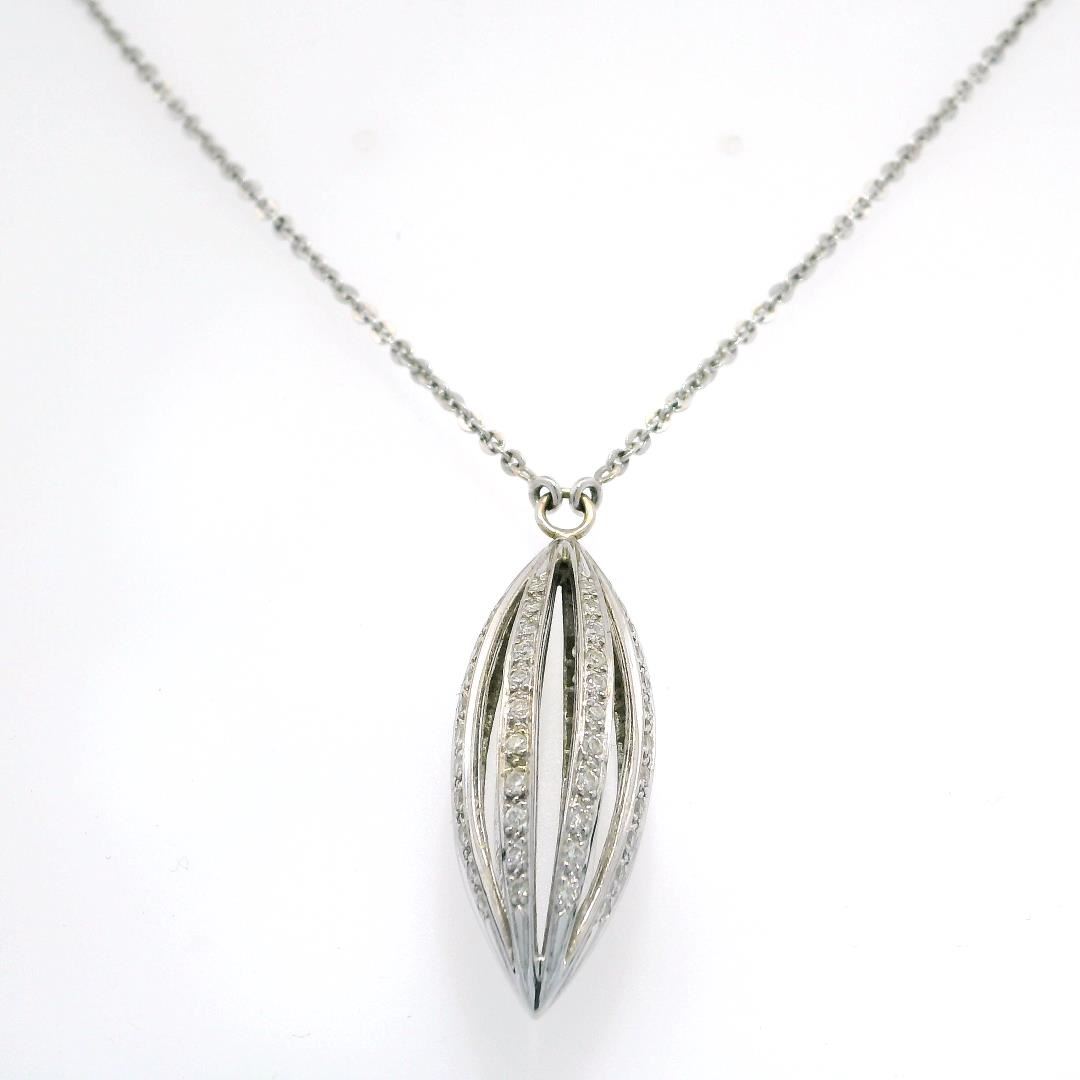 An 18KT white gold marquise motif pendant with a 16-inch chain. Adorned with 0.80ct total weight of round brilliant cut diamonds, graded VS-1 to VS-2 clarity. The pendant features a 33mm drop and is secured with a lobster claw clasp.