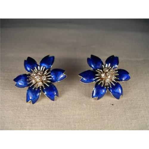 You are looking at a stunning set of 18K white gold enameled floral earrings with diamonds. The petals are removeable. These authentic earrings are by the famous jewelry designer Hidalgo. Each earring consists of 2 parts: navy blue petals and a 6 brilliant round diamond stud insertable into it. Each piece measures 1 & 1/4 inches in diameter. The set weighs 19.2 grams. It is in mint condition.
