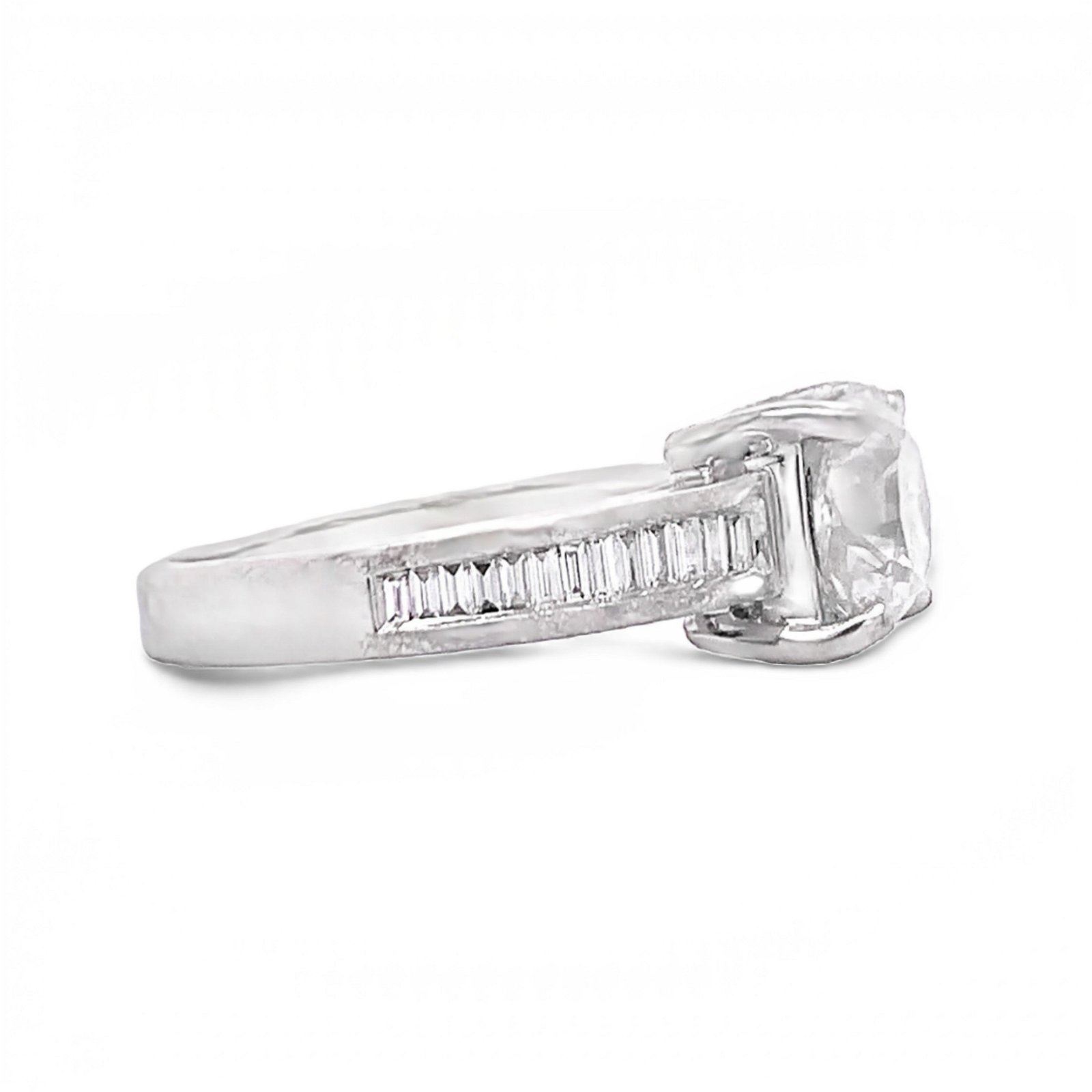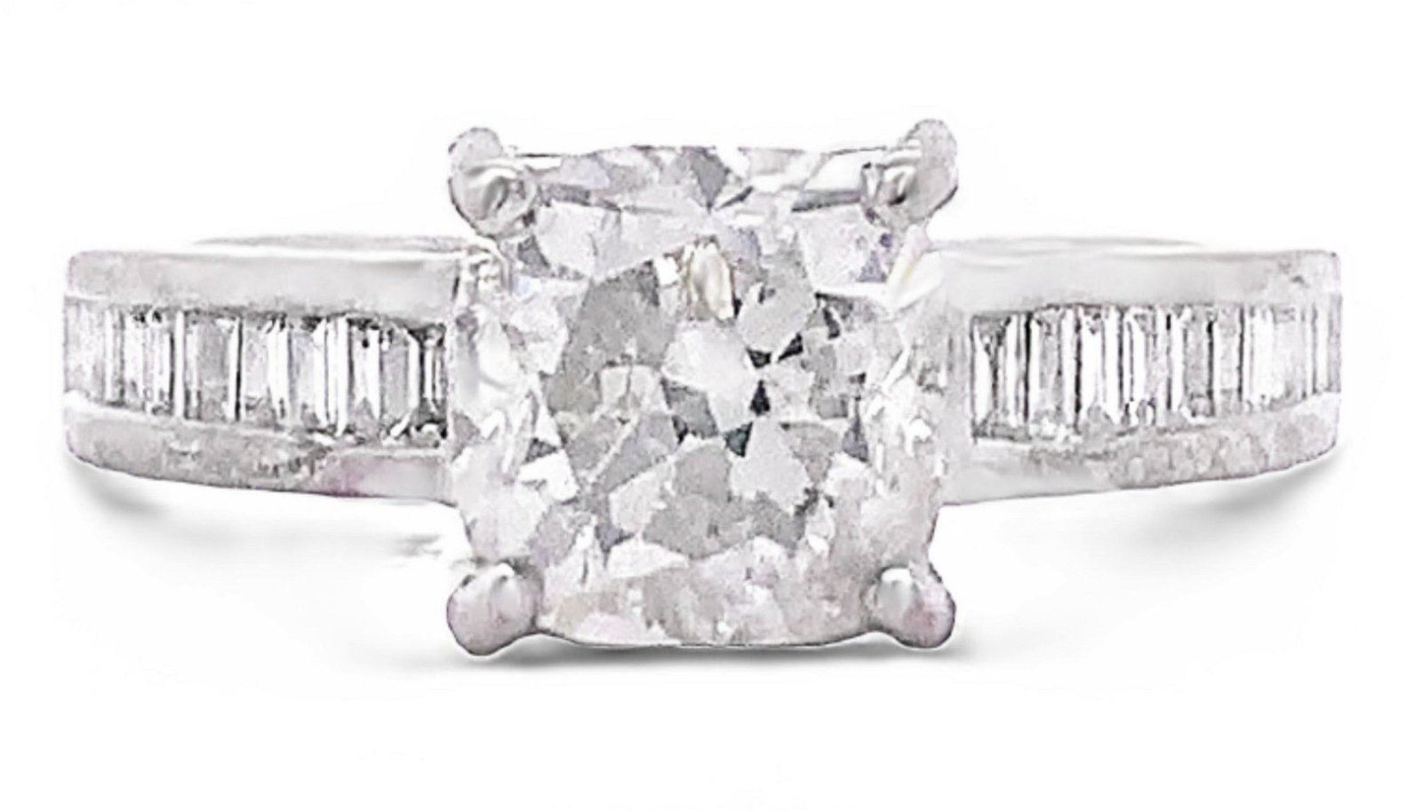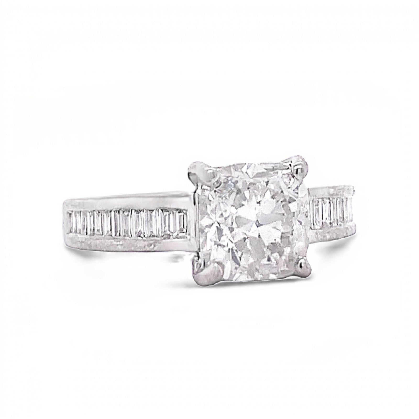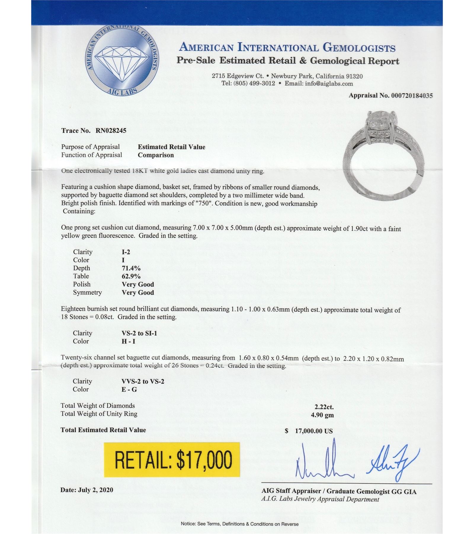 One electronically tested 18KT white gold ladies cast diamond unity ring. Featuring a cushion shape diamond, basket set, framed by ribbons of smaller round diamonds, supported by baguette diamond set shoulders, completedby a two millimeter wide band. Bright polish finish. Identified with markings of "750". Condition is new, good workmanship One prong set cushion cut diamond, measuring 7.00 x 7.00 x 5.00mm (depth est.) approximate weight of 1.90ct with a faint yellow green fluorescence. Graded in the setting Clarity: I-2 Color: Depth 71.4% Table: 62.9% Polish: Very Good Symmetry: Very Good Eighteen burnish set round brilliant cut diamonds,measuring 1.10 - 1.00 x 0.63mm (depth est.) approximate total weight of 18 Stones = 0.08ct. Graded in the setting Clarity: VS-2 to SI-1 Color: H - I Twenty-six channel set baguette cut diamonds, measuring from 1.60 x0.80 x 0.54mm (depth est.) to 2.20 x 1.20 x 0.82mm (depth est.) approximate total weight of 26 Stones = 0.24ct. Graded in the setting Clarity: VVS-2 to VS-2 Color: E - G Total Weight of Diamonds: 2.22ct