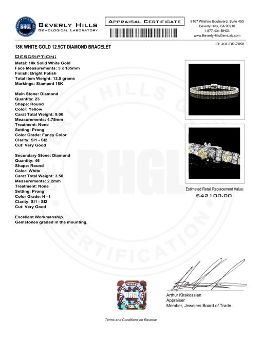 Retail: $42100.00 ****** Metal: 18k Solid White Gold / Size: 7.5 / Total Item Weight: 13.5 grams / Country Made: USA / / Main Stone: Diamond / Color: Yellow / Carat Total Weight: 9.00 / Treatment: None / Color Grade: Fancy Color / Clarity: SI1 - SI2 / Cut: Very Good / / Secondary Stone: Diamond / Carat Total Weight: 3.50 / Treatment: None / Color Grade: H - I / Clarity: SI1 - SI2 / Cut: Very Good / ****** Ref: JQL-BR-7058