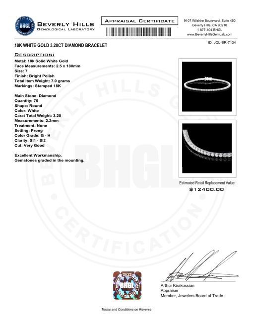 Regarding Appraised Jewelry and Loose Stones - WESTBURY AUCTION GALLERIES sends them out to a third party for Retail Replacement Value Appraisals, which are the most common. These types of evaluations are written for insurance needs. This would be the cost to replace the jewelry with an item of equal quality and kind, considered to be the current market price or the replacement value. This type of appraisal is done to protect you in the event of damage or loss of a valuable item. Our appraisals are conducted by independent 3rd Party appraisal firms that utilizes Certified GIA Gemologist. Appraisals should be used for verification of gemstone and/or metal weight, size, and grade only, not actual value. Appraisal value should be considered for insurance purposes only, not actual value, as price varies greatly from retail locations thru out the world. Items should not be purchased with the expectation to resell for appraisal price, or for profit.