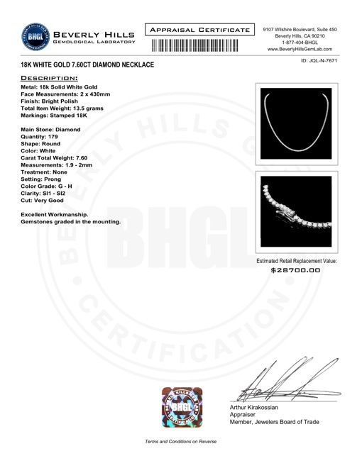 Regarding Appraised Jewelry and Loose Stones - WESTBURY AUCTION GALLERIES sends them out to a third party for Retail Replacement Value Appraisals, which are the most common. These types of evaluations are written for insurance needs. This would be the cost to replace the jewelry with an item of equal quality and kind, considered to be the current market price or the replacement value. This type of appraisal is done to protect you in the event of damage or loss of a valuable item. Our appraisals are conducted by independent 3rd Party appraisal firms that utilizes Certified GIA Gemologist. Appraisals should be used for verification of gemstone and/or metal weight, size, and grade only, not actual value. Appraisal value should be considered for insurance purposes only, not actual value, as price varies greatly from retail locations thru out the world. Items should not be purchased with the expectation to resell for appraisal price, or for profit.