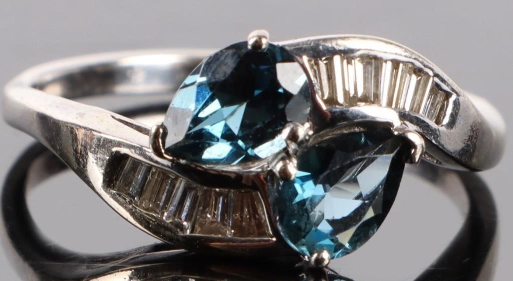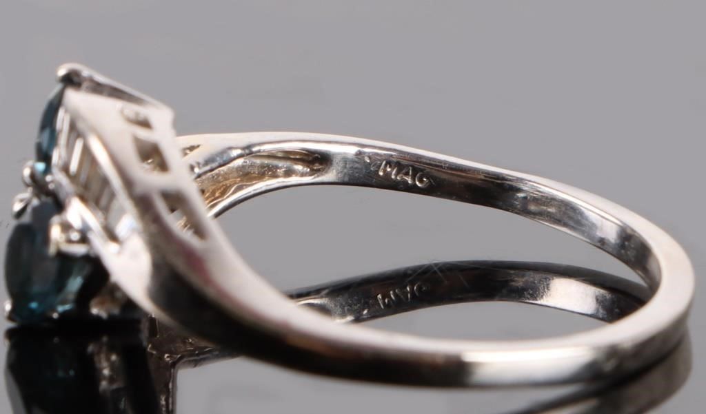 18K white gold blue spinel diamond ladies ring. Gemstones to include two 0.50ct tear drop cut blue spinel, ten 0.01ct to 0.02ct trapezoidal cut diamonds.
