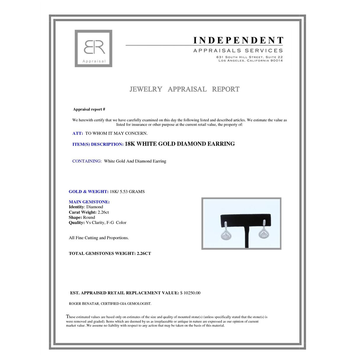 18K WHITE GOLD DIAMOND EARRING:5.53 GRAMS/DIAMOND:2.26CT/#R8038