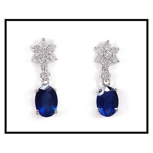 Two natural sapphires exhibit vivid color as they dangle from diamond floral ornaments. The 16 full cut diamonds weigh a total of .36 carats, and the sapphires have combined weight of 1.95 carats. These elegant earrings of 18K white gold have been beautifully made and will be treasured heirlooms. Was priced for $950.