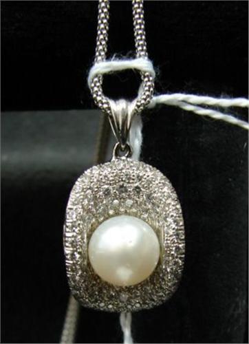 18K WHITE GOLD DIAMOND & PEARL PENDANT. Has approx. 1 ¾ ct. t.w. of round diamonds VS2-SI1 clarity & G-I color, set surrounding 10.5mm South Sea Pearl in center. Also has 24" 14K white gold chain. 15.4 grams wt. of items. Has CAGA appraisal.