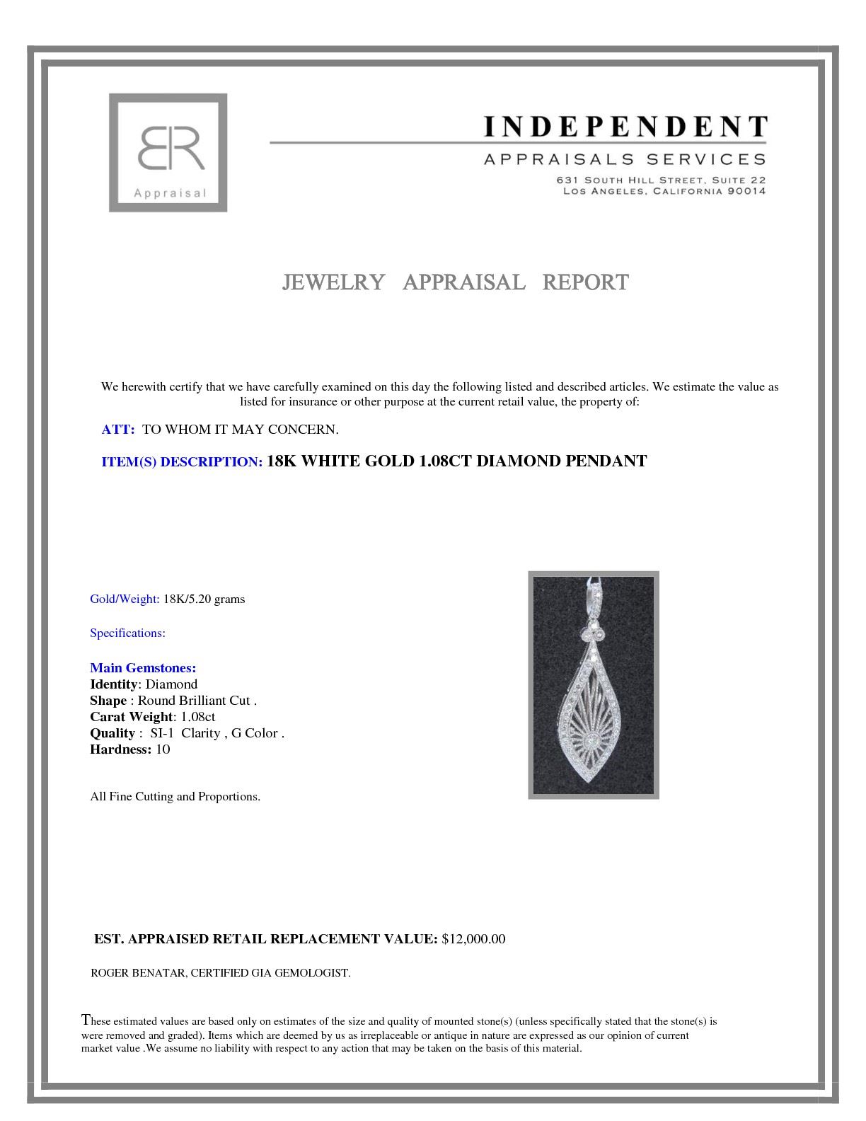 18K WHITE GOLD DIAMOND PENDANT:5.20 GRAMS/DIAMOND:1.08CT/#R8007