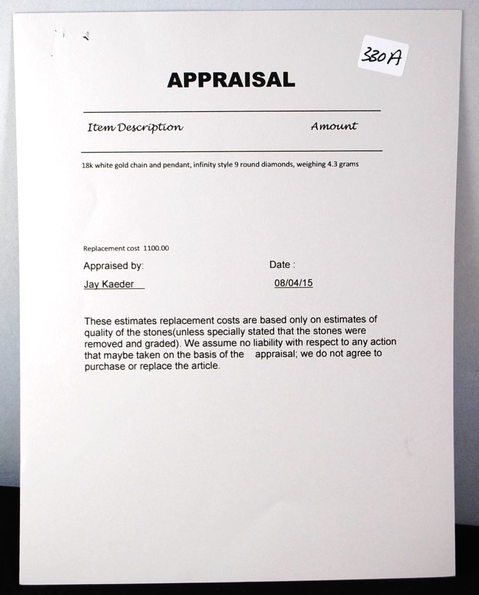 18K WHITE GOLD PENDANT & CHAIN, INFINITY STYLE, 9 ROUND DIAMONDS. THE APPRAISED REPLACEMENT COST IS $1,100.00. AND COMES WITH THE APPRAISAL FOR INSURANCE PURPOSES