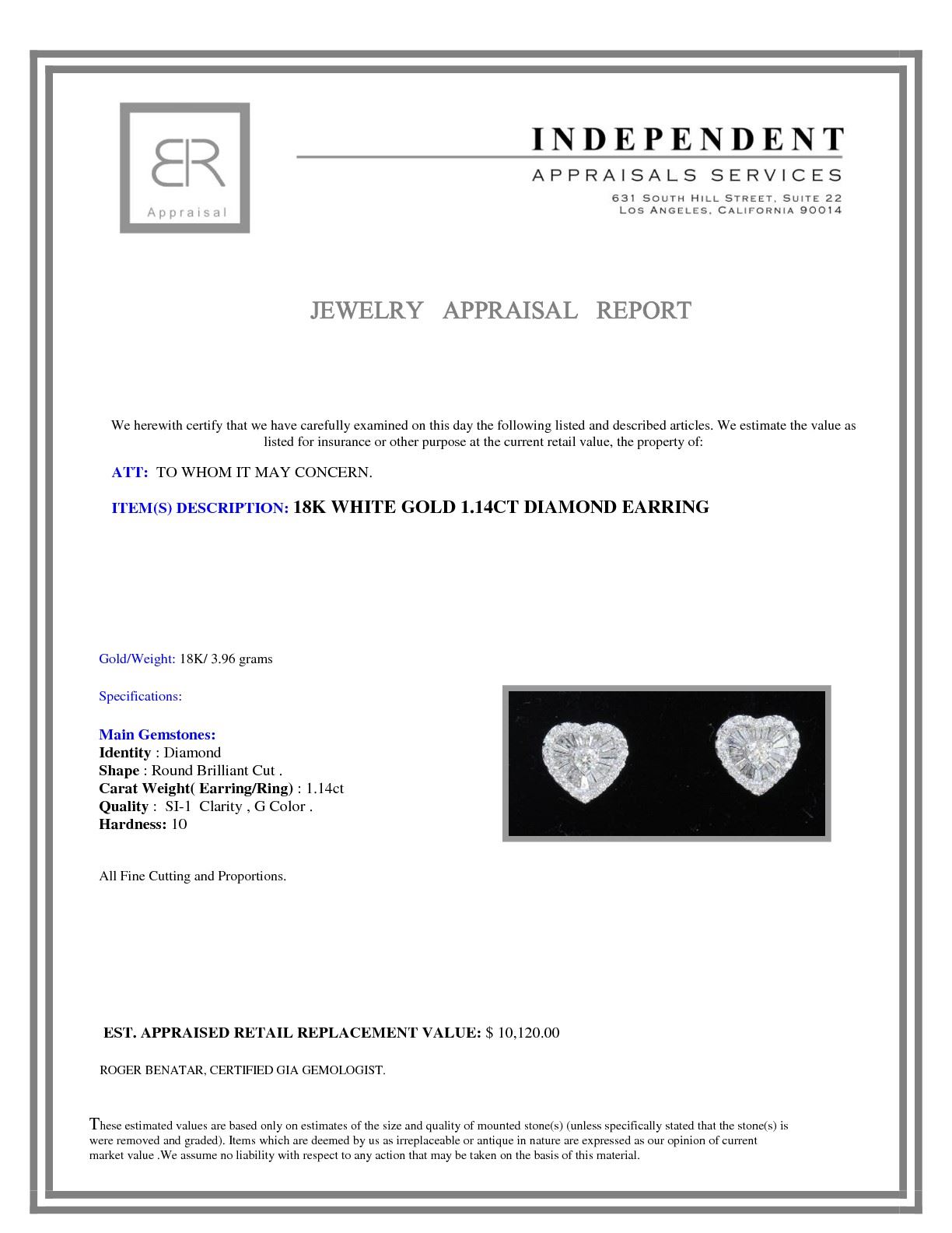 18K WHITE GOLD DIOAMOND EARRING:3.96 GRAMS/DIAMOND:1.14CT/#R8009