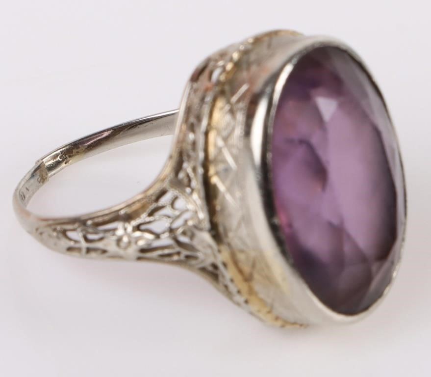 18K white gold filigree amethyst ladies ring. Gemstones to include one 17.10 X 12.60 Millimeter oval cut amethyst.