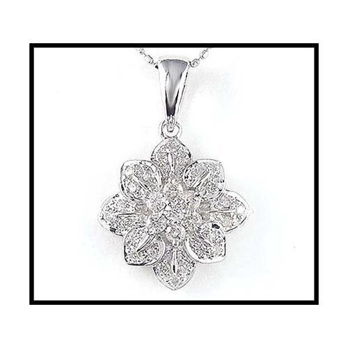 This bold floral design pendant in 18K white gold is set with 31 full cut diamonds. It is 15mm (9/16") in diameter. Was priced for $695. No chain. A rich and stunning piece!!!