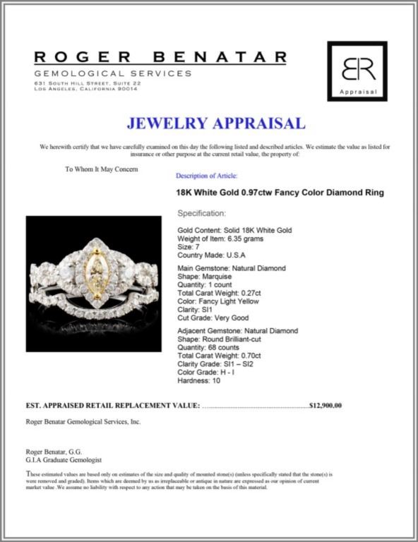 Regarding Appraised Jewelry and Loose Stones - Auctionfarm sends them out to a third party for Retail Replacement Value Appraisals, which are the most common. These types of evaluations are written for insurance needs. This would be the cost to replace the jewelry with an item of equal quality and kind, considered to be the current market price or the replacement value. This type of appraisal is done to protect you in the event of damage or loss of a valuable item. Our appraisals are conducted by independent 3rd Party appraisal firms that utilizes Certified GIA Gemologist. Appraisals should be used for verification of gemstone and/or metal weight, size, and grade only, not actual value. Appraisal value should be considered for insurance purposes only, not actual value, as price varies greatly from retail locations thru out the world. Items should not be purchased with the expectation to resell for appraisal price, or for profit.
