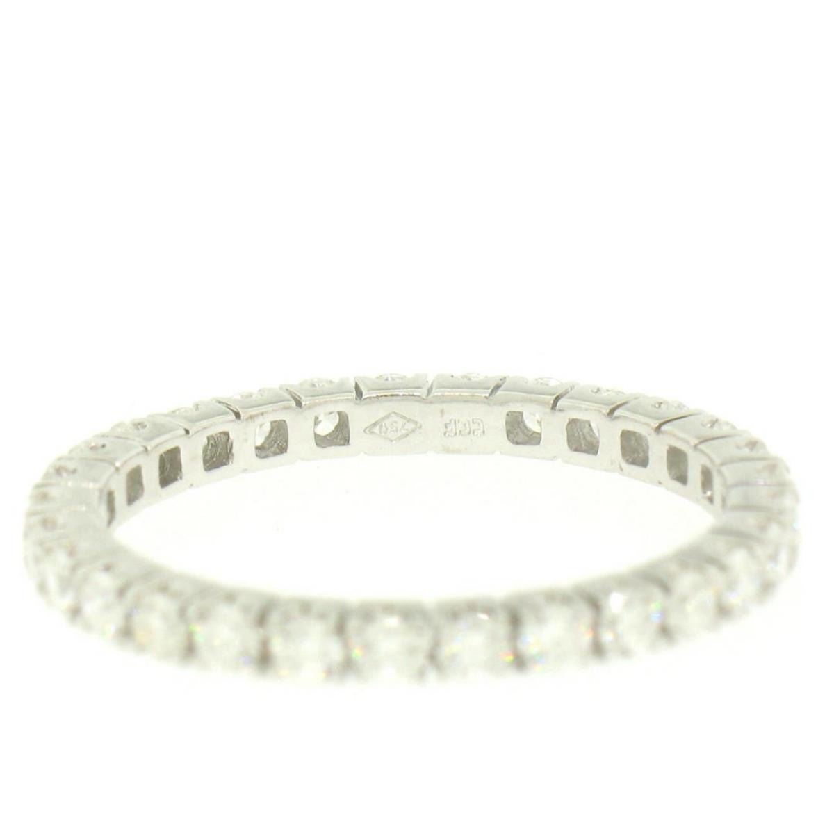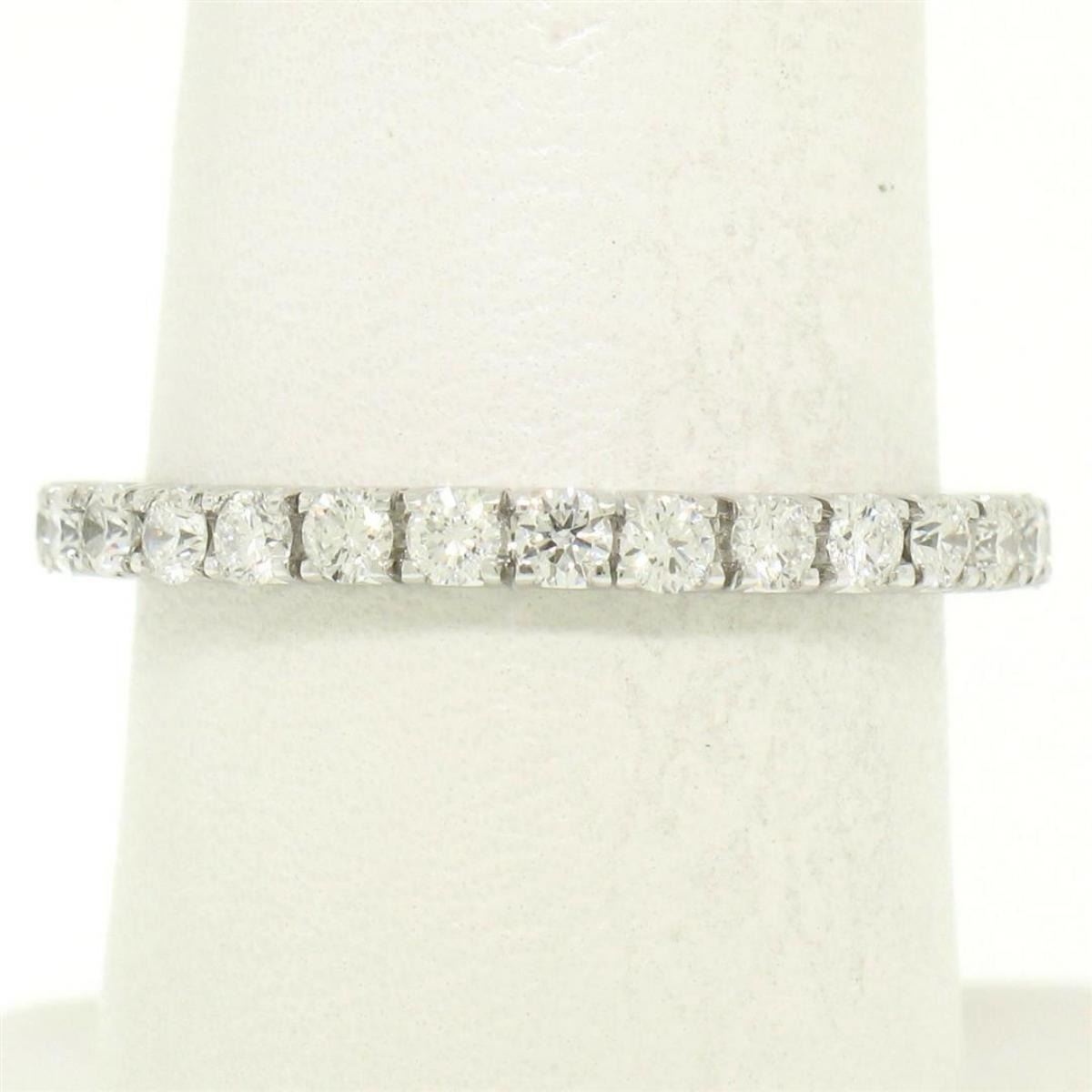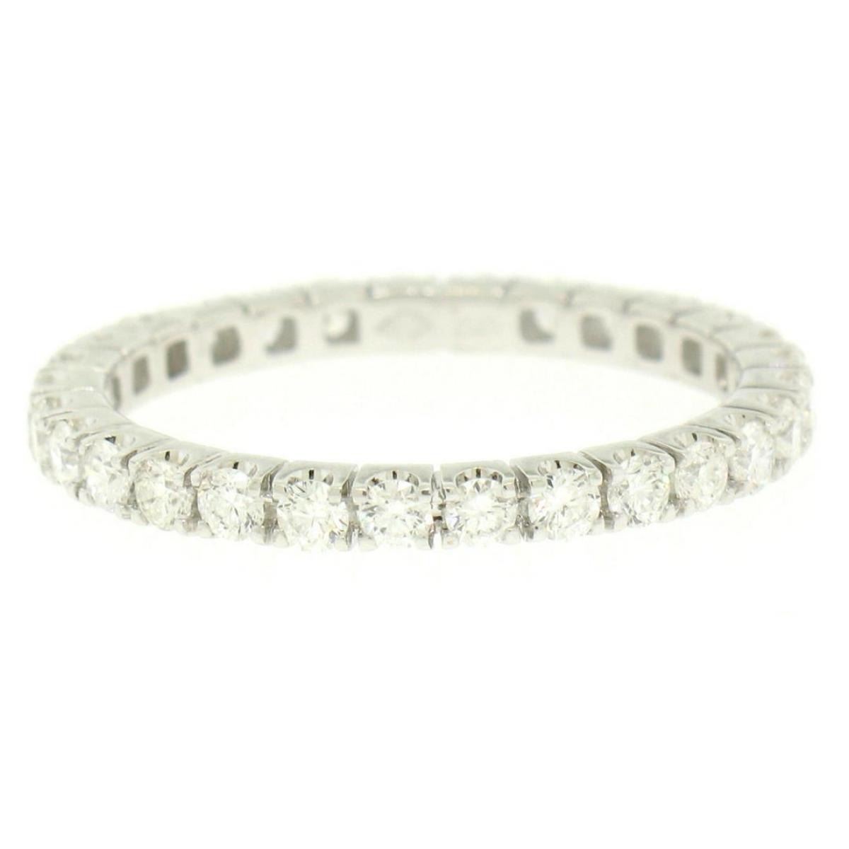 One 18K White Gold 1.0ctw F VS1 Round Brilliant Prong Set Diamond Eternity Band Ring. Item Details: Material: 18k Solid White Gold, Weight: 2.5 Grams, Stone(s): (29) Natural Genuine Diamonds - Round Brilliant Cut - Prong Set - F/G Color - VS1 Clarity, Total Carat Weight: 1.00 (approx.), Ring Size: 8.0 (We can not custom size this ring.), Ring Width: 2.2mm, Ring Height: 2.2mm rise off the finger, Condition: Like New!