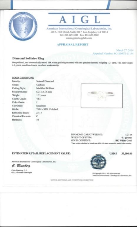 Regarding Appraised Jewelry and Loose Stones - Auctionfarm sends them out to a third party for Retail Replacement Value Appraisals, which are the most common. These types of evaluations are written for insurance needs. This would be the cost to replace the jewelry with an item of equal quality and kind, considered to be the current market price or the replacement value. This type of appraisal is done to protect you in the event of damage or loss of a valuable item. Our appraisals are conducted by independent 3rd Party appraisal firms that utilizes Certified GIA Gemologist. Appraisals should be used for verification of gemstone and/or metal weight, size, and grade only, not actual value. Appraisal value should be considered for insurance purposes only, not actual value, as price varies greatly from retail locations thru out the world. Items should not be purchased with the expectation to resell for appraisal price, or for profit.