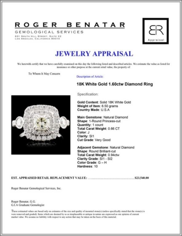 Estimated Retail Replacement Value: $23,540.00Ref: WAG9416Item no.: FA2054477003-R6824ACDSpecification:Gold Content: Solid 18K White Gold Weight of Item: 6.50 gramsCountry Made: U.S.A Main Gemstone: Natural Diamond Shape: 1-Round Princess-cut Quantity: 1 countTotal Carat Weight: 0.66 CTColor: JClarity: SI1Cut Grade: Very GoodAdjacent Gemstone: Natural Diamond Shape: Round Brilliant-cutTotal Carat Weight: 0.94ctwClarity Grade: SI1 - SI2Color Grade: G – H Hardness: 10 Great Condition - Shipping notes: We ship 4-10 Business day after the clearance of payment. Tracking numbers are emailed once the package(s) are shipped. Most shipments are sent by FEDEX Priority, UPS Priority, or US PRIORITY MAIL INSURED