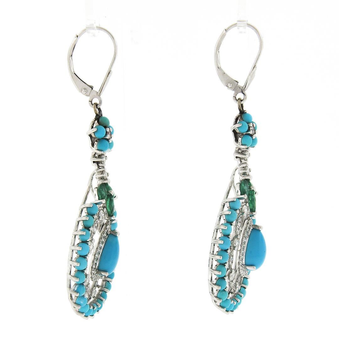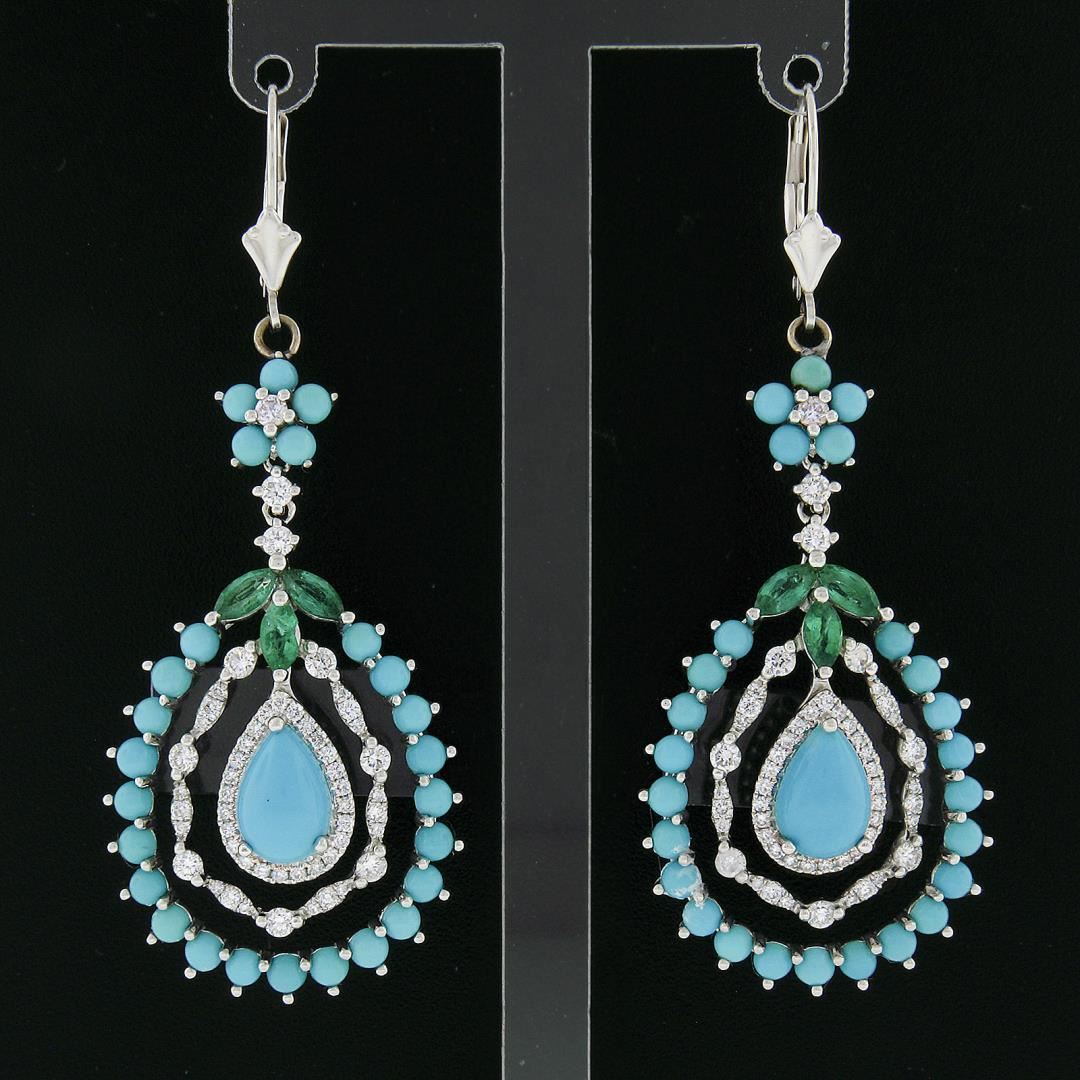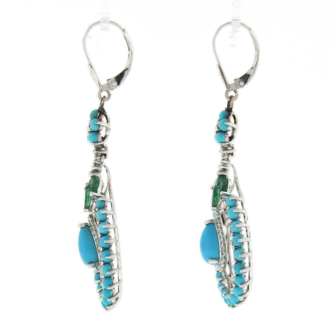 A solid 18k white gold teardrop dangle earrings, with 2 pear cabochon cut natural turqoises (9x6.3mm each ), numerous of bead shape natural turquoises (2.5mm each ), 6 marquise cut natural emeralds (0.50ctw ), and 106 round cut natural diamonds (G/H - VS2/SI1 ; 1.20ctw). The earrings measure approximately 59.2x23.1mm and weigh a total of 10.68 grams.