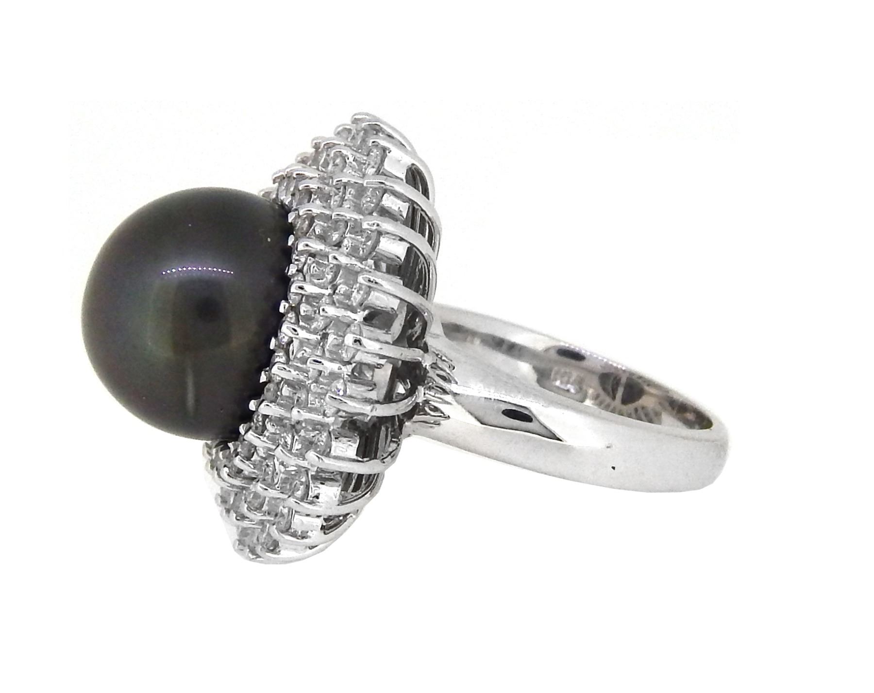 One 18K White Gold 14mm Tahitian Pearl and Diamond Ring. (1) Tahitian Pearl measuring 14mm. (72) Diamonds with a total weight of 2.09cts. Total weight of the ring is 16.2 grams.