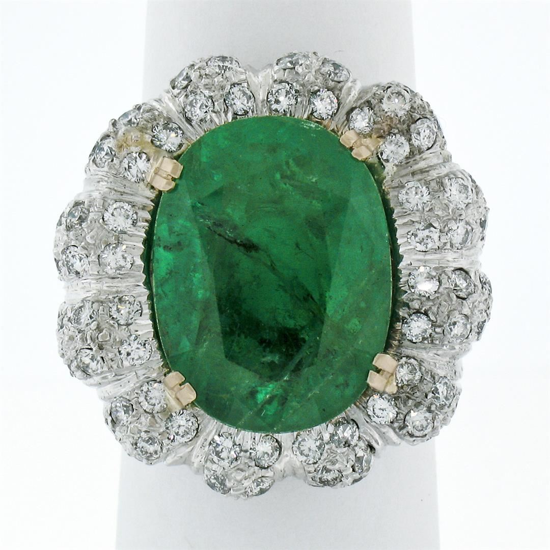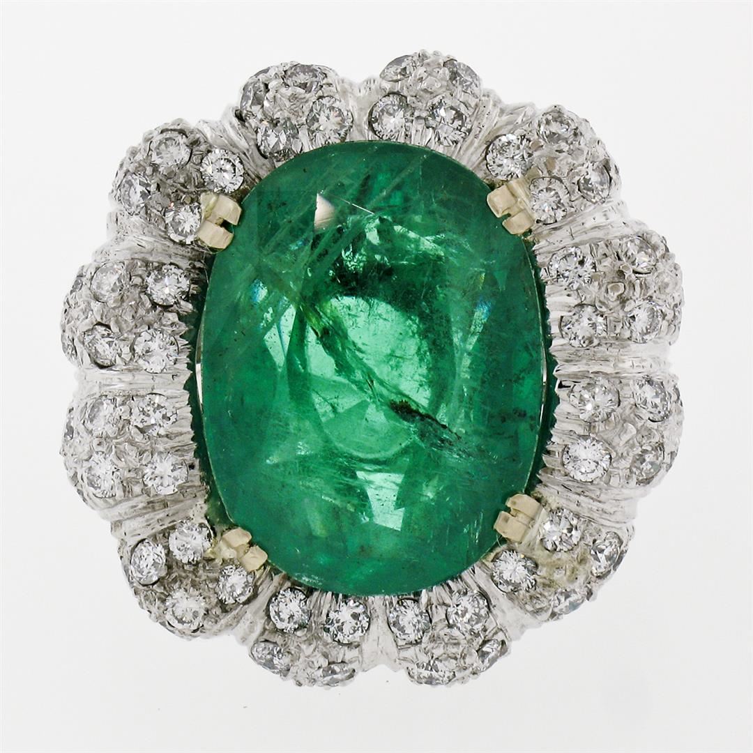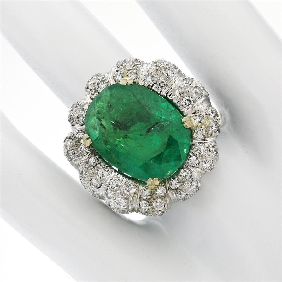 One 18K White Gold 15.15ctw Large Oval Brilliant GIA Emerald & Diamond Cocktail Ring. Item Details: Material: Solid 18k White Gold, Weight: 17.94 Grams, Stone(s): (1) Natural Genuine Emerald - Emerald Cut - Prong Set - Super Rich, Pure, Emerald Green Color - 13.40ct (exact), (116) Natural Genuine Diamonds - Round Brilliant Cut - Pave Set - G/H Color - VS1/VS2 Clarity - 1.75ctw (approx.), Total Carat Weight: 15.15 (exact), Ring Size: 8.0 (We can custom size this ring.), Ring Diameter: 24.85mm (north to south), 24.50mm (east to west), Ring Height: 8.95mm rise off the finger, Condition: Estate statement ring. Comes w/ original GIA certification for the emerald. Excellent condition and ready to wear., Certification Details, Laboratory: GIA, Report Number: 2185805126, Species: Natural Beryl, Variety: Emerald, Geographic Origin: Zambia, Stone Shape: Oval Brilliant Cut, Dimensions: 17.45 x 13.05 x 8.74 mm, Color: Green, Transparency: Transparent, Treatment: Clarity Enhanced (F2)