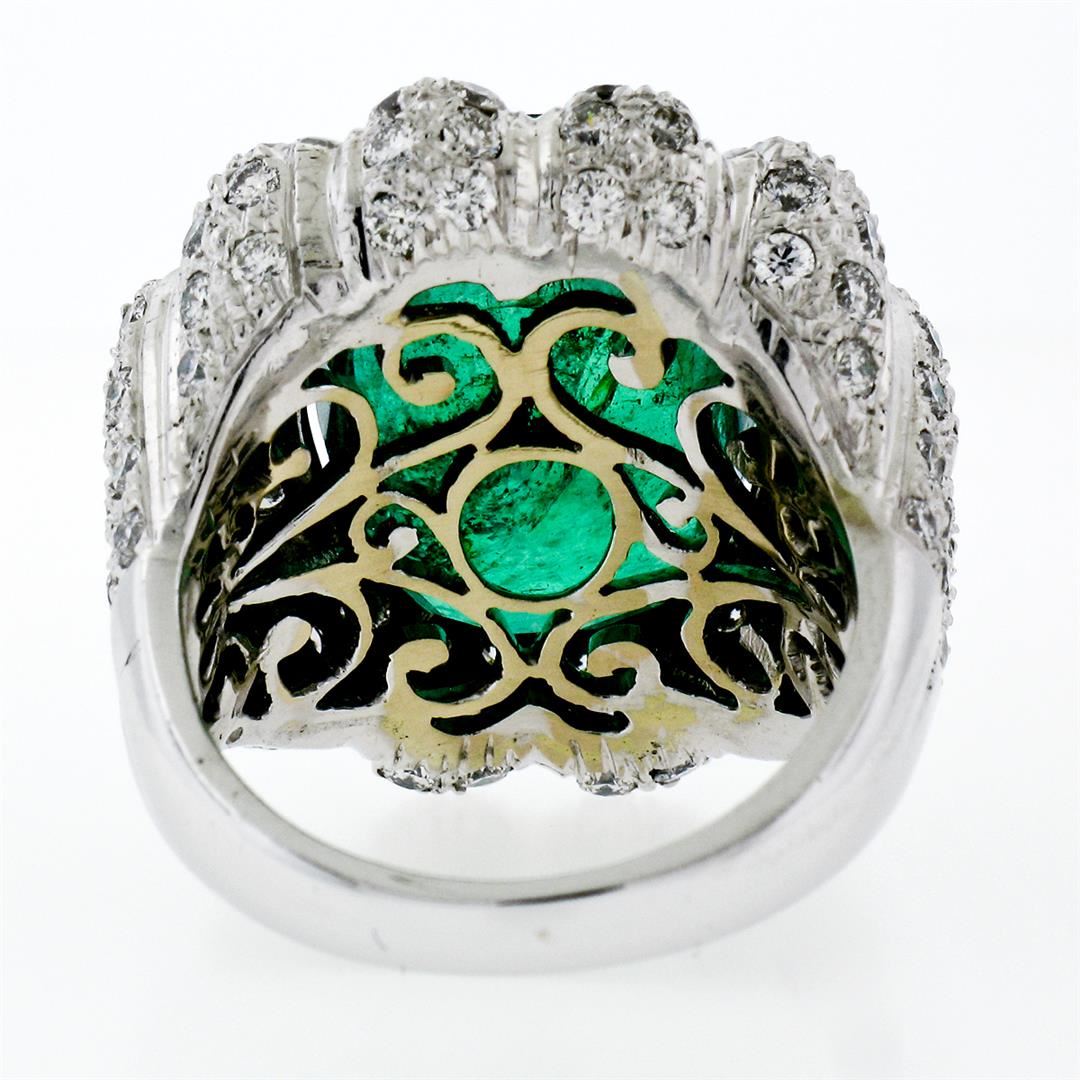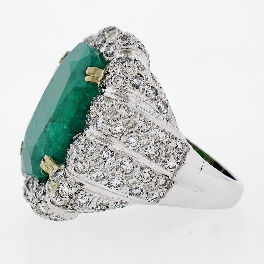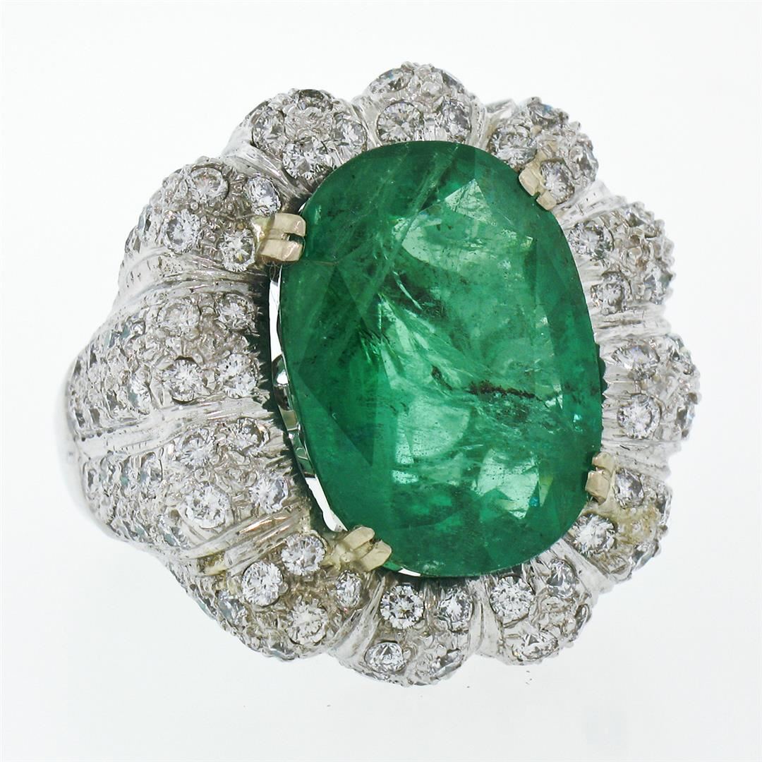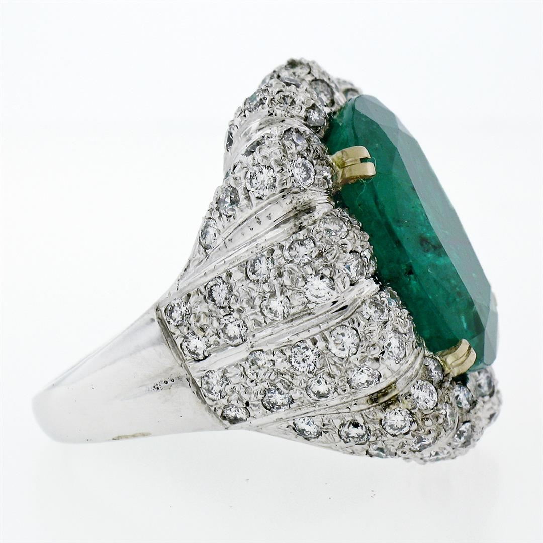 One 18K White Gold 15.15ctw Large Oval Brilliant GIA Emerald & Diamond Cocktail Ring. Item Details: Material: Solid 18k White Gold, Weight: 17.94 Grams, Stone(s): (1) Natural Genuine Emerald - Emerald Cut - Prong Set - Super Rich, Pure, Emerald Green Color - 13.40ct (exact), (116) Natural Genuine Diamonds - Round Brilliant Cut - Pave Set - G/H Color - VS1/VS2 Clarity - 1.75ctw (approx.), Total Carat Weight: 15.15 (exact), Ring Size: 8.0 (We can custom size this ring.), Ring Diameter: 24.85mm (north to south), 24.50mm (east to west), Ring Height: 8.95mm rise off the finger, Condition: Estate statement ring. Comes w/ original GIA certification for the emerald. Excellent condition and ready to wear., Certification Details, Laboratory: GIA, Report Number: 2185805126, Species: Natural Beryl, Variety: Emerald, Geographic Origin: Zambia, Stone Shape: Oval Brilliant Cut, Dimensions: 17.45 x 13.05 x 8.74 mm, Color: Green, Transparency: Transparent, Treatment: Clarity Enhanced (F2)