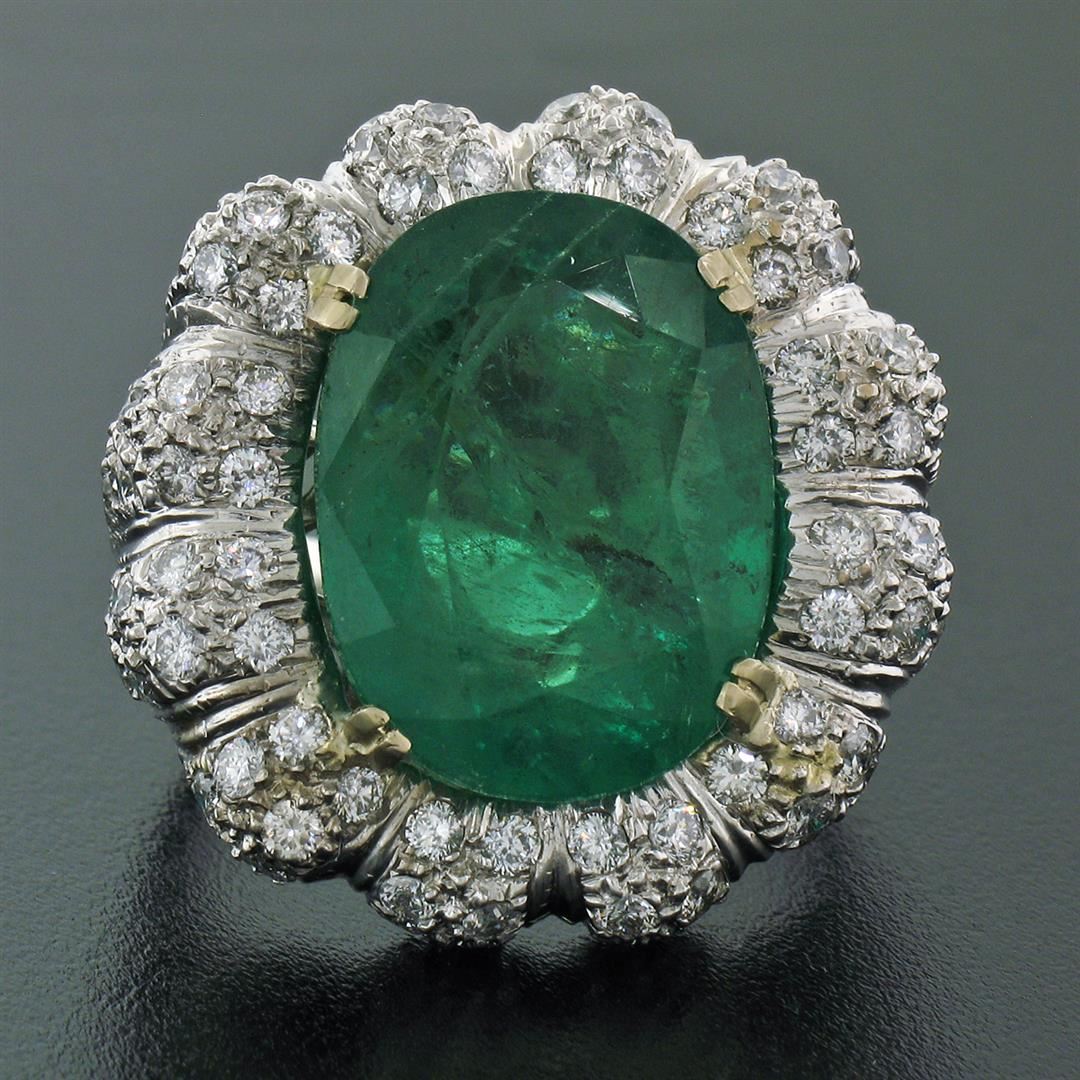 One 18K White Gold 15.15ctw Large Oval Brilliant GIA Emerald & Diamond Cocktail Ring. Item Details: Material: Solid 18k White Gold, Weight: 17.94 Grams, Stone(s): (1) Natural Genuine Emerald - Emerald Cut - Prong Set - Super Rich, Pure, Emerald Green Color - 13.40ct (exact), (116) Natural Genuine Diamonds - Round Brilliant Cut - Pave Set - G/H Color - VS1/VS2 Clarity - 1.75ctw (approx.), Total Carat Weight: 15.15 (exact), Ring Size: 8.0 (We can custom size this ring.), Ring Diameter: 24.85mm (north to south), 24.50mm (east to west), Ring Height: 8.95mm rise off the finger, Condition: Estate statement ring. Comes w/ original GIA certification for the emerald. Excellent condition and ready to wear., Certification Details, Laboratory: GIA, Report Number: 2185805126, Species: Natural Beryl, Variety: Emerald, Geographic Origin: Zambia, Stone Shape: Oval Brilliant Cut, Dimensions: 17.45 x 13.05 x 8.74 mm, Color: Green, Transparency: Transparent, Treatment: Clarity Enhanced (F2)