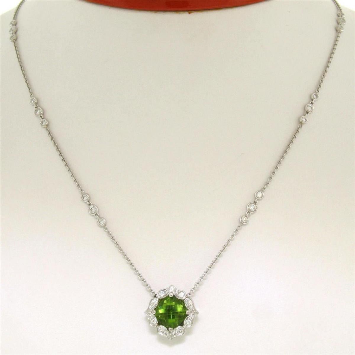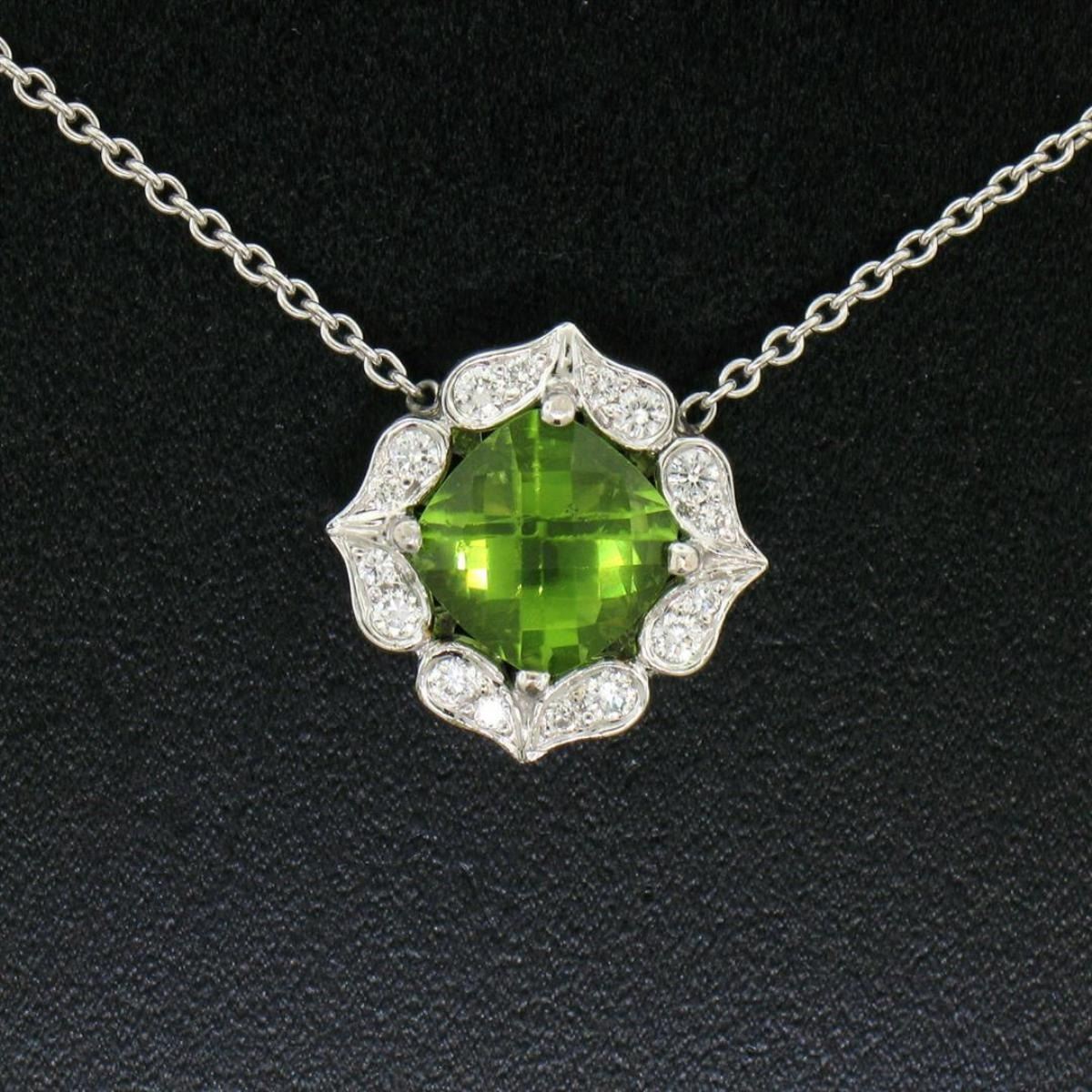 One 18K White Gold 16" 3.12ctw F VS Diamond Cushion Peridot Flower Cluster Necklace. Item Details: Material: 18K Solid White Gold, Weight: 6.9 Grams, Stone(s): (1) Natural Genuine Peridot - Checkerboard Cushion Cut - Prong Set - Rich Lime Green Color - 2.50ct (approx.), (36) Natural Genuine Diamonds - Round Brilliant Cut - Pavé Set - VS1 Clarity - F Color - 0.45ctw (approx.), (18) Natural Genuine Diamonds - Round Brilliant Cut - Bezel Set - VS1 Clarity - F Color - 0.17ctw (approx.), Total Carat Weight: 3.12 (approx.), Chain Type: Cable Link Chain w/ Bezel Set Diamond Clusters, Chain Length: 16 Inches Clasp: Lobster Claw Width: 15.20mm Height: 15.20mm Thickness: 6.35mm Condition: Great overall condition. Ready to wear!