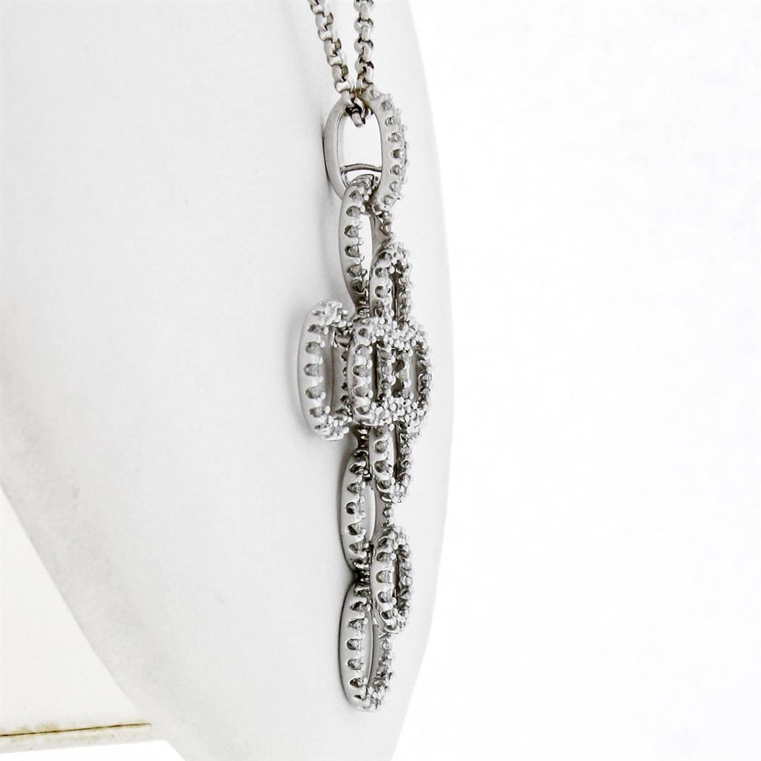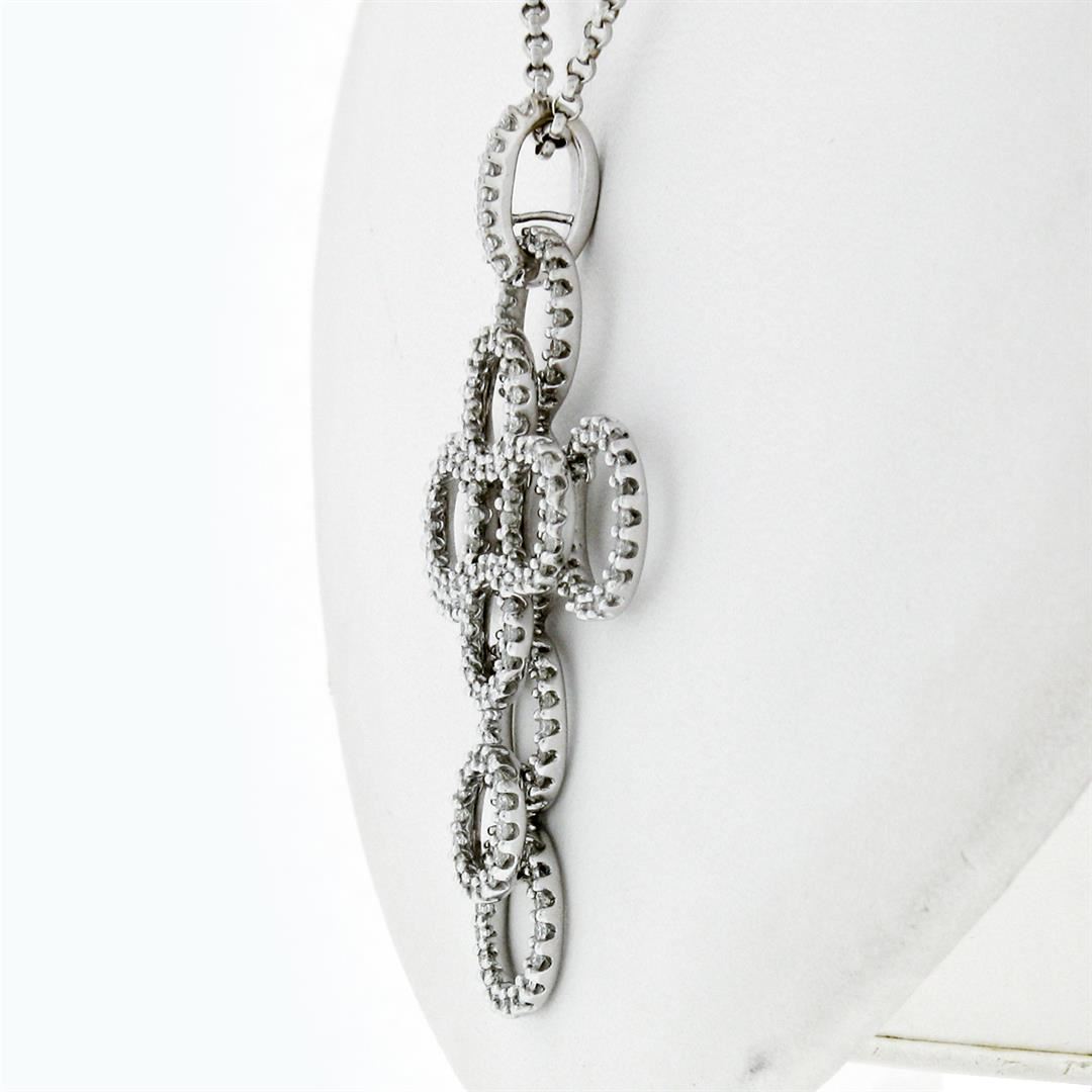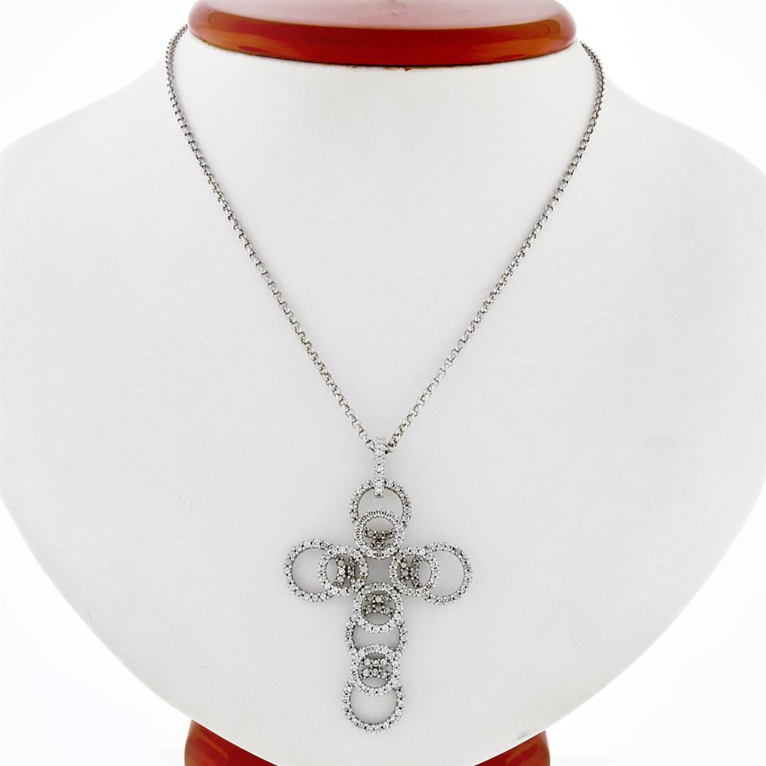 One 18K White Gold 2.08ctw Shared Prong Diamond Multi Circle Cross Pendant Necklace. Item Details: Material:  18k Solid White Gold, Weight:  11.68 Grams, Stone(s):  (208) Natural Genuine Diamonds - Round Brilliant Cut - Shared Prong Set - VS1/VS2 Clarity - G/H Color - 2.08ctw (approx.), Chain Type:  Rolo Link Chain, Chain Length:  17 Inches, Clasp:  Spring Ring Clasp, Width:  32.75mm (1.29"), Height:  50.50mm (1.98") Thickness:  4.0mm Condition:  Like New!