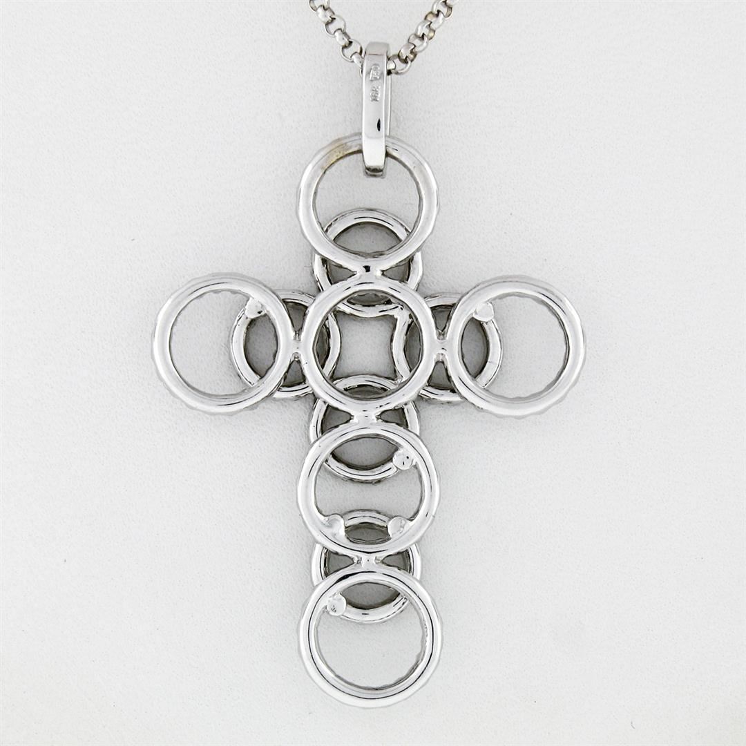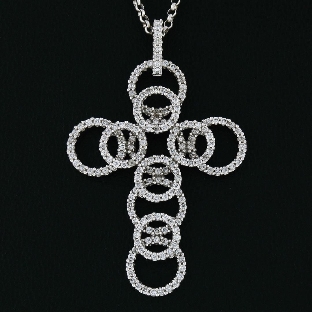 One 18K White Gold 2.08ctw Shared Prong Diamond Multi Circle Cross Pendant Necklace. Item Details: Material: 18k Solid White Gold, Weight: 11.68 Grams, Stone(s): (208) Natural Genuine Diamonds - Round Brilliant Cut - Shared Prong Set - VS1/VS2 Clarity - G/H Color - 2.08ctw (approx.), Chain Type: Rolo Link Chain, Chain Length: 17 Inches, Clasp: Spring Ring Clasp, Width: 32.75mm (1.29"), Height: 50.50mm (1.98") Thickness: 4.0mm Condition: Like New!