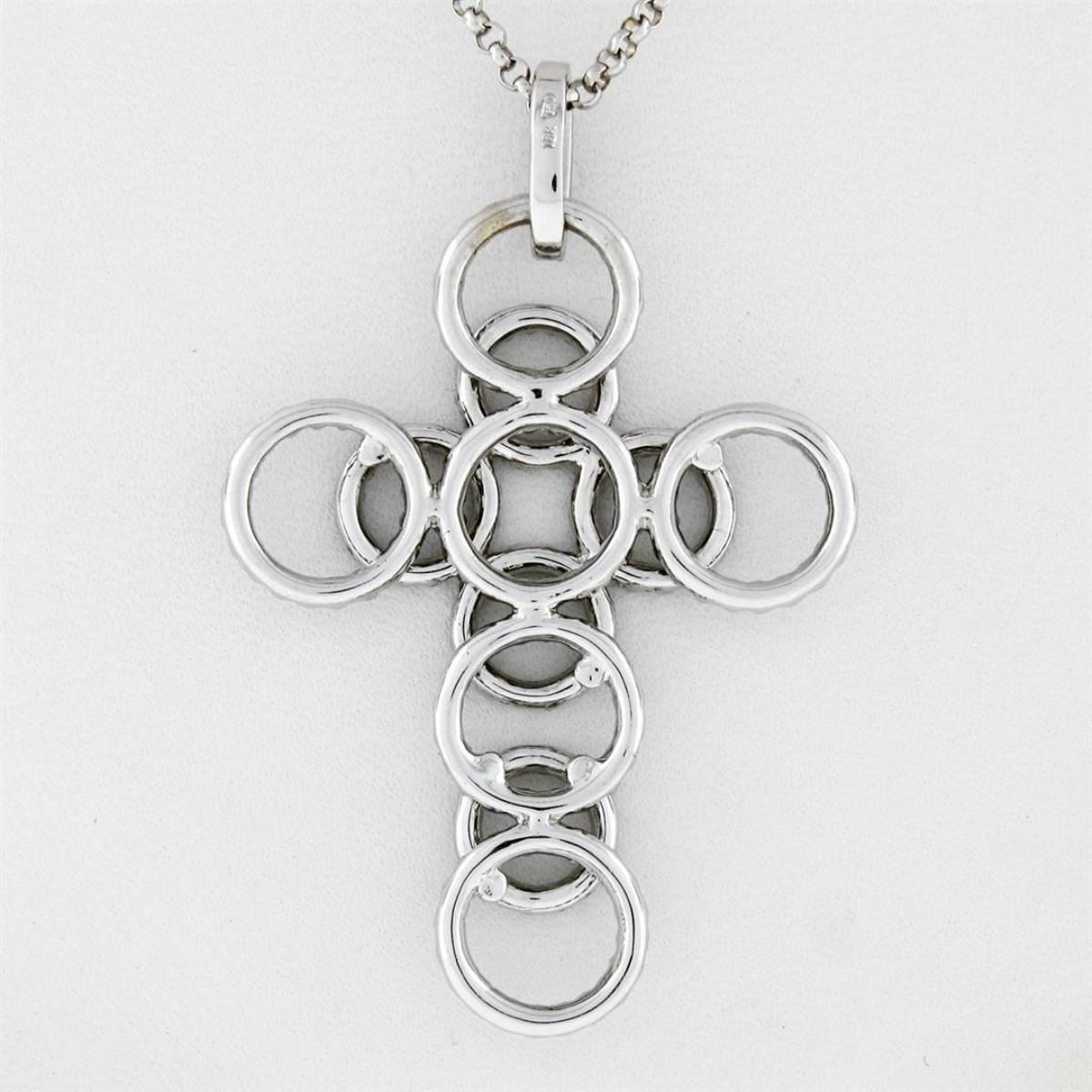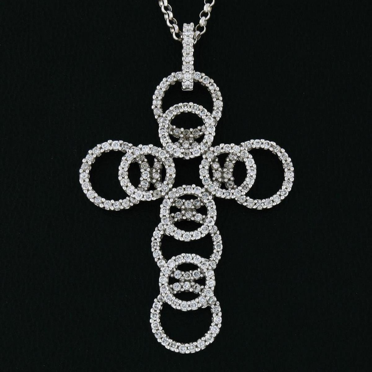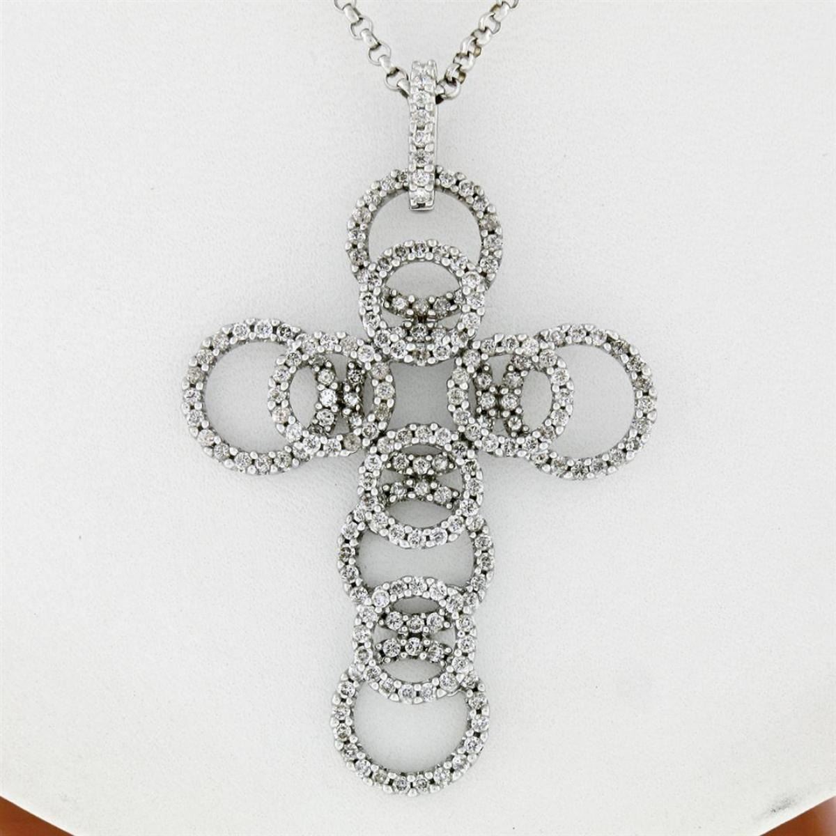 One 18K White Gold 2.08ctw Shared Prong Diamond Multi Circle Cross Pendant Necklace. Item Details: Material: 18k Solid White Gold, Weight: 11.68 Grams, Stone(s): (208) Natural Genuine Diamonds - Round Brilliant Cut - Shared Prong Set - VS1/VS2 Clarity - G/H Color - 2.08ctw (approx.), Chain Type: Rolo Link Chain, Chain Length: 17 Inches, Clasp: Spring Ring Clasp, Width: 32.75mm (1.29"), Height: 50.50mm (1.98") Thickness: 4.0mm Condition: Like New!