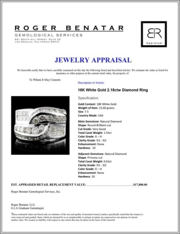 Regarding Appraised Jewelry and Loose Stones - Auctionfarm sends them out to a third party for Retail Replacement Value Appraisals, which are the most common. These types of evaluations are written for insurance needs. This would be the cost to replace the jewelry with an item of equal quality and kind, considered to be the current market price or the replacement value. This type of appraisal is done to protect you in the event of damage or loss of a valuable item. Our appraisals are conducted by independent 3rd Party appraisal firms that utilizes Certified GIA Gemologist. Appraisals should be used for verification of gemstone and/or metal weight, size, and grade only, not actual value. Appraisal value should be considered for insurance purposes only, not actual value, as price varies greatly from retail locations thru out the world. Items should not be purchased with the expectation to resell for appraisal price, or for profit.