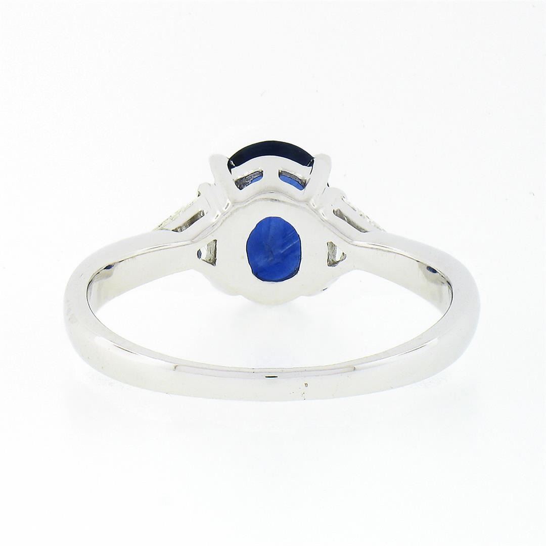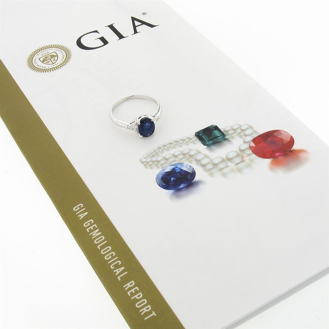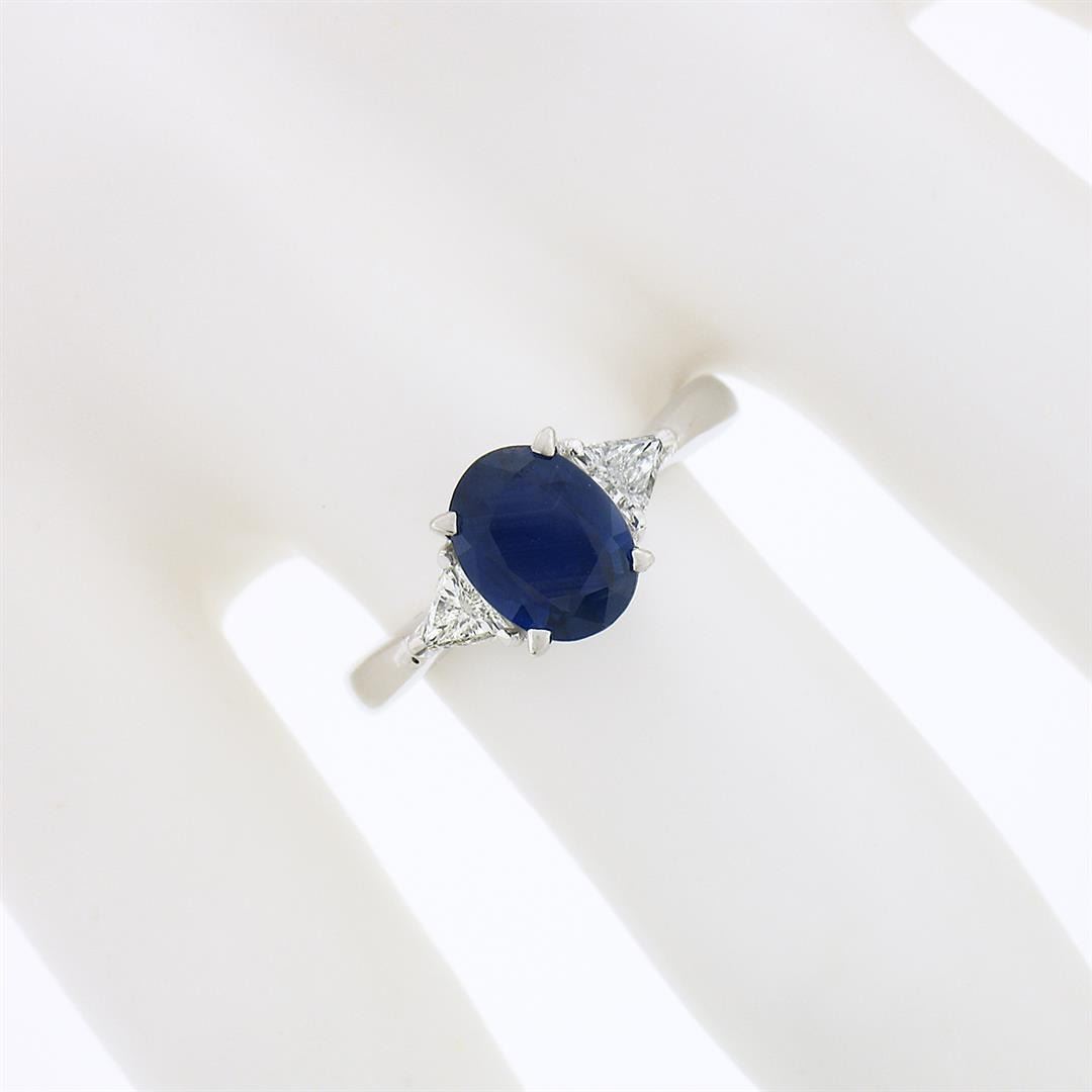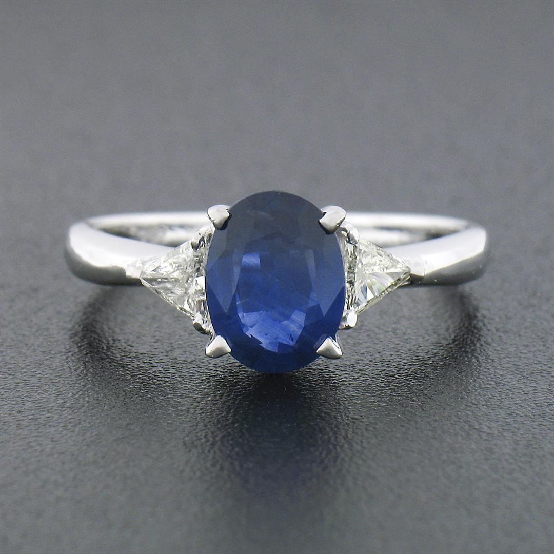 A solid 18k white gold 3 stones ring, with 1 Gia certified oval cut natural sapphire (1.65ct ), and 2 trillion cut natural diamonds (H/I - VS2 ; 0.56ctw). The ring is size 7.0, weighs a total of 3.32 grams, and measures 8.15mm wide. Comes with all original relevant certifications.