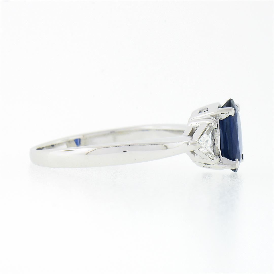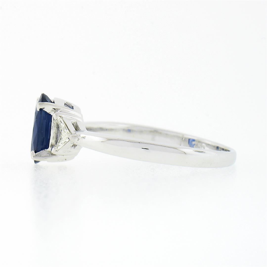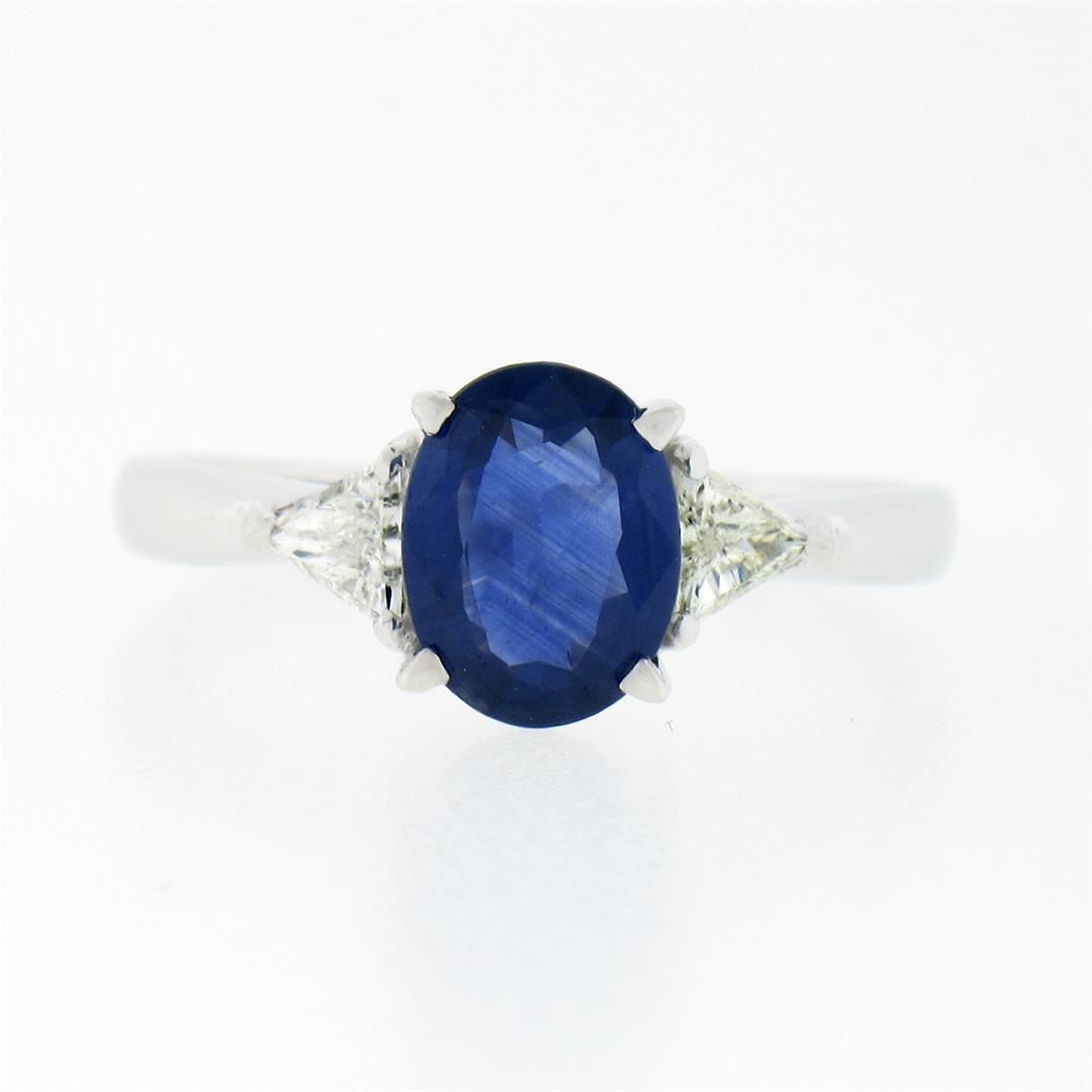 A solid 18k white gold 3 stones ring, with 1 Gia certified oval cut natural sapphire (1.65ct ), and 2 trillion cut natural diamonds (H/I - VS2 ; 0.56ctw). The ring is size 7.0, weighs a total of 3.32 grams, and measures 8.15mm wide. Comes with all original relevant certifications.