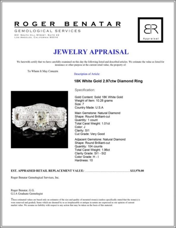 Regarding Appraised Jewelry and Loose Stones - Auctionfarm sends them out to a third party for Retail Replacement Value Appraisals, which are the most common. These types of evaluations are written for insurance needs. This would be the cost to replace the jewelry with an item of equal quality and kind, considered to be the current market price or the replacement value. This type of appraisal is done to protect you in the event of damage or loss of a valuable item. Our appraisals are conducted by independent 3rd Party appraisal firms that utilizes Certified GIA Gemologist. Appraisals should be used for verification of gemstone and/or metal weight, size, and grade only, not actual value. Appraisal value should be considered for insurance purposes only, not actual value, as price varies greatly from retail locations thru out the world. Items should not be purchased with the expectation to resell for appraisal price, or for profit.