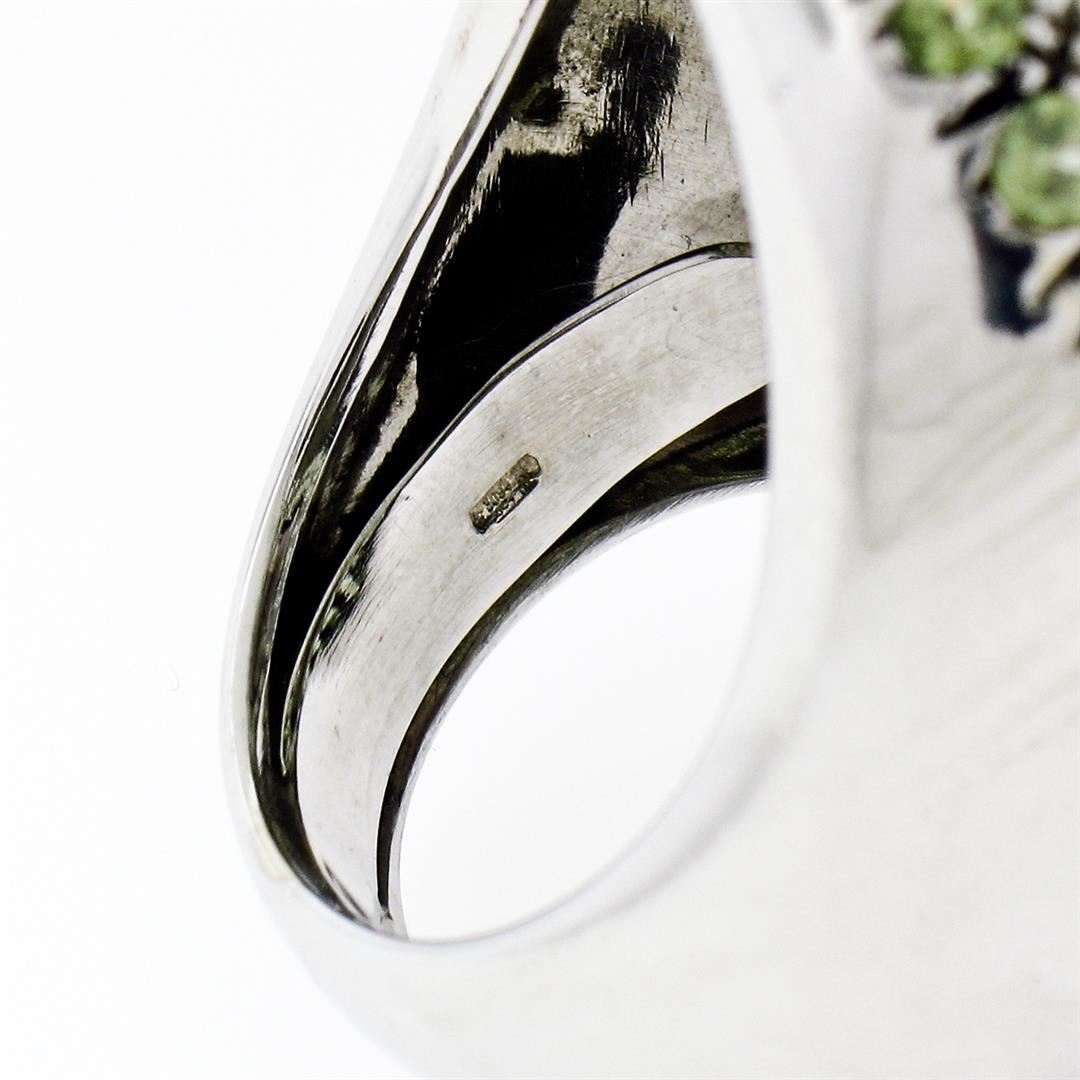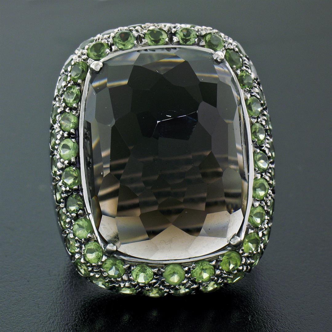 An estate solid 18k white gold solitaire ring, with 1 Domed Rectangular Cut nagural topaz (24.0x18.3mm - 35ct ), surrounded with 57 round cut natural peridot (2.60ctw). The ring is size 7.5, weighs a total of 22.02 grams, and measures 31.60mm wide.