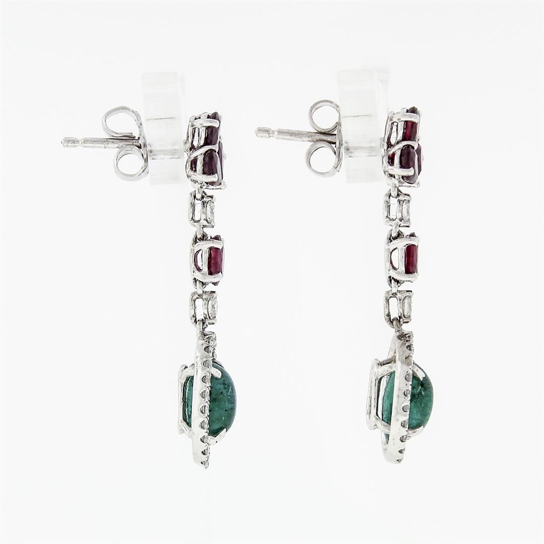 A pair of solid 18k white gold dangle drop earrings, with 2 oval cabochon cut natural emeralds (7x5mm ; 2.10ctw ), and 8 pear with oval cut natural rubies (1.70ctw ), with 50 round brilliant cut natural diamonds ( G/H - VS1/VS2 ; 0.35ctw). The earrings measure approximately 30x8.1mm and weigh a total of 3.67 grams.