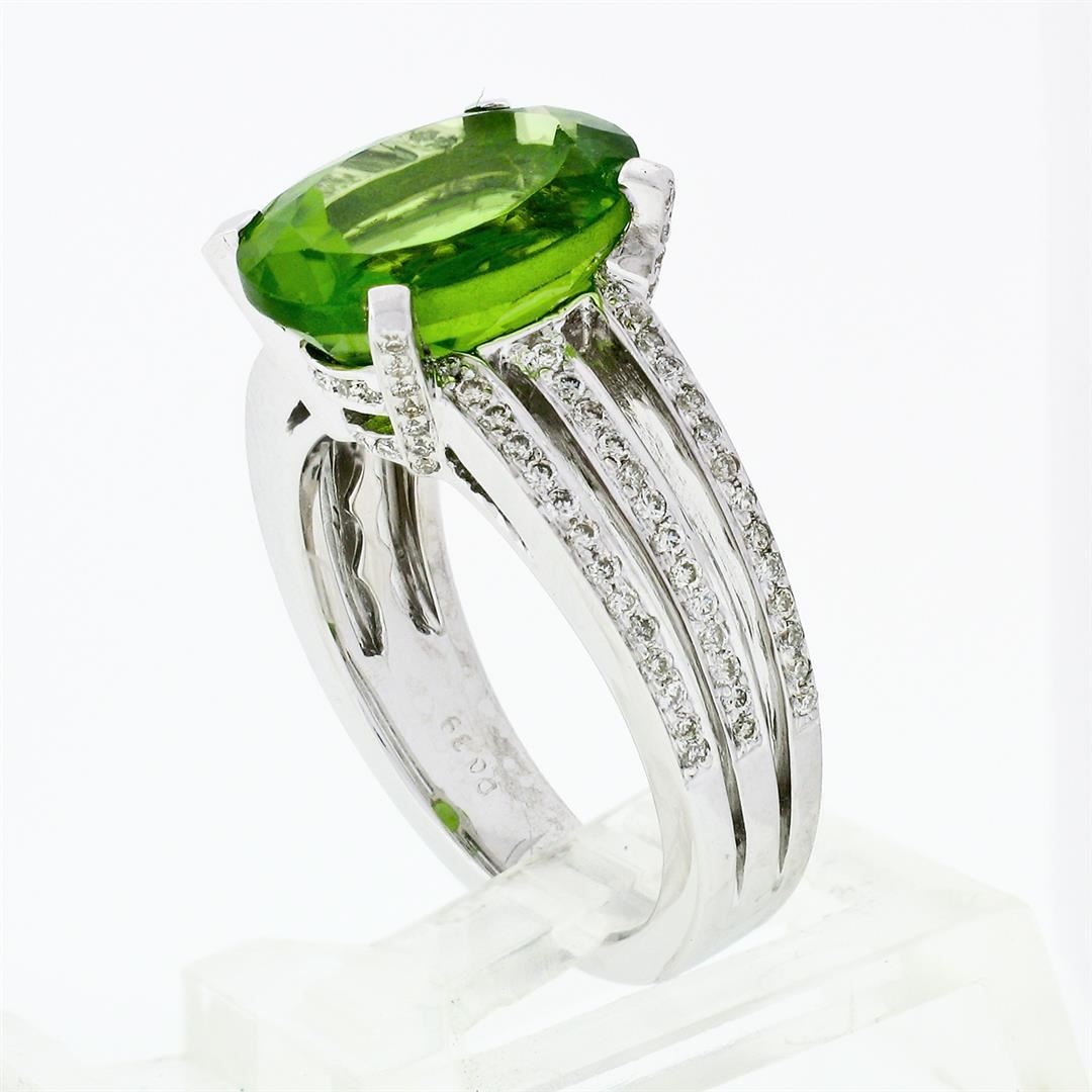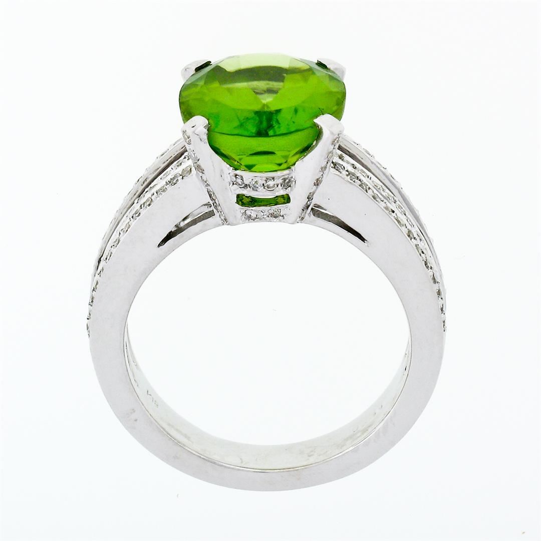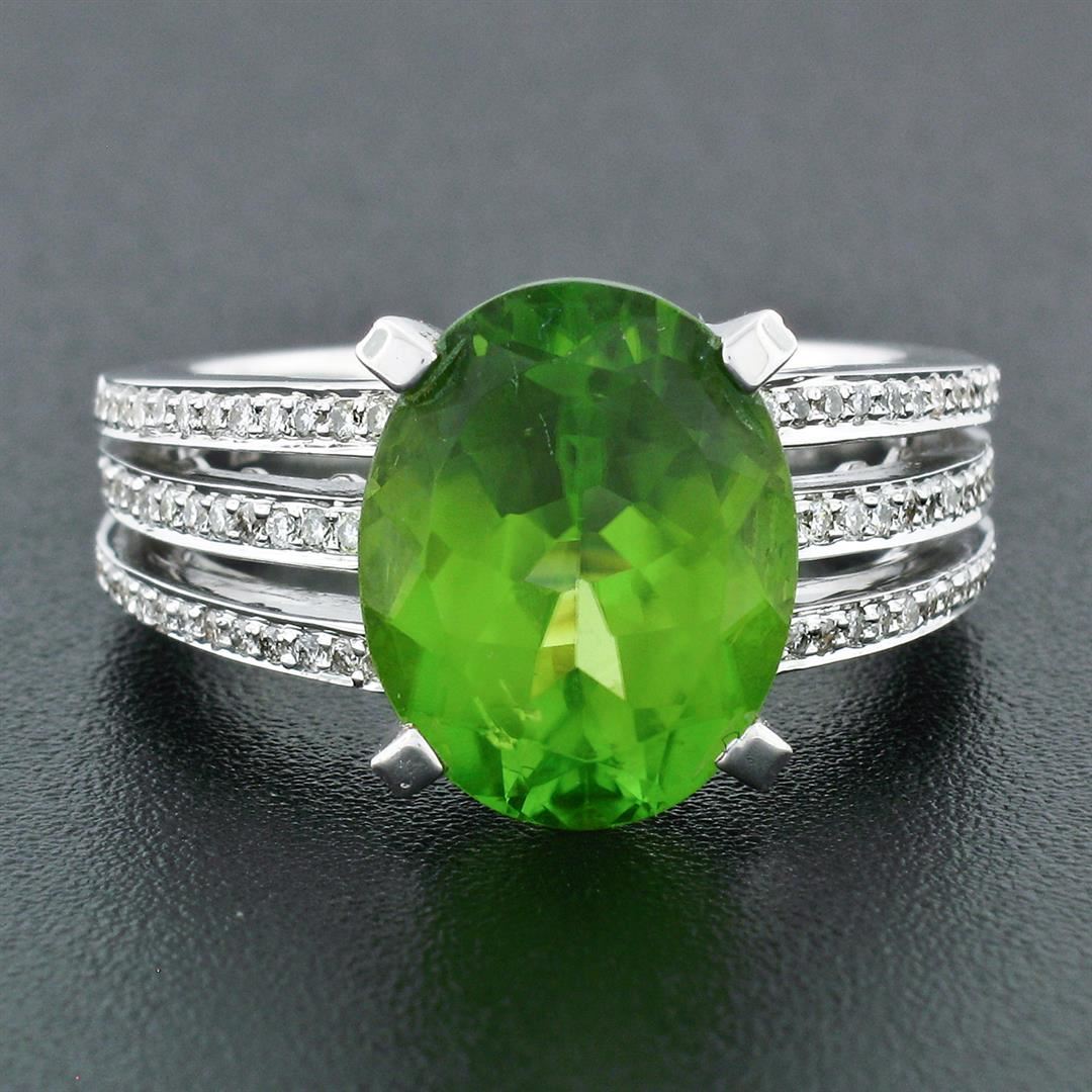 A solid 18k white gold solitaire engagement ring with 1 oval cut, vivid lime green, natural peridot (12.3x9.7mm - 4.35ct) and 128 round brilliant cut natural diamonds (G/H - VS1/VS2; 0.39ctw). The ring is size 6.0, weighs a total of 9.33 grams, and measures 12.3mm wide.