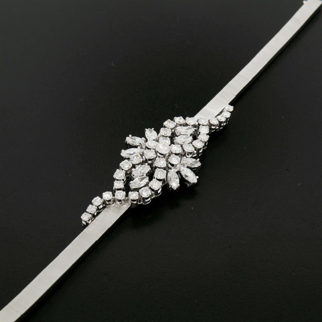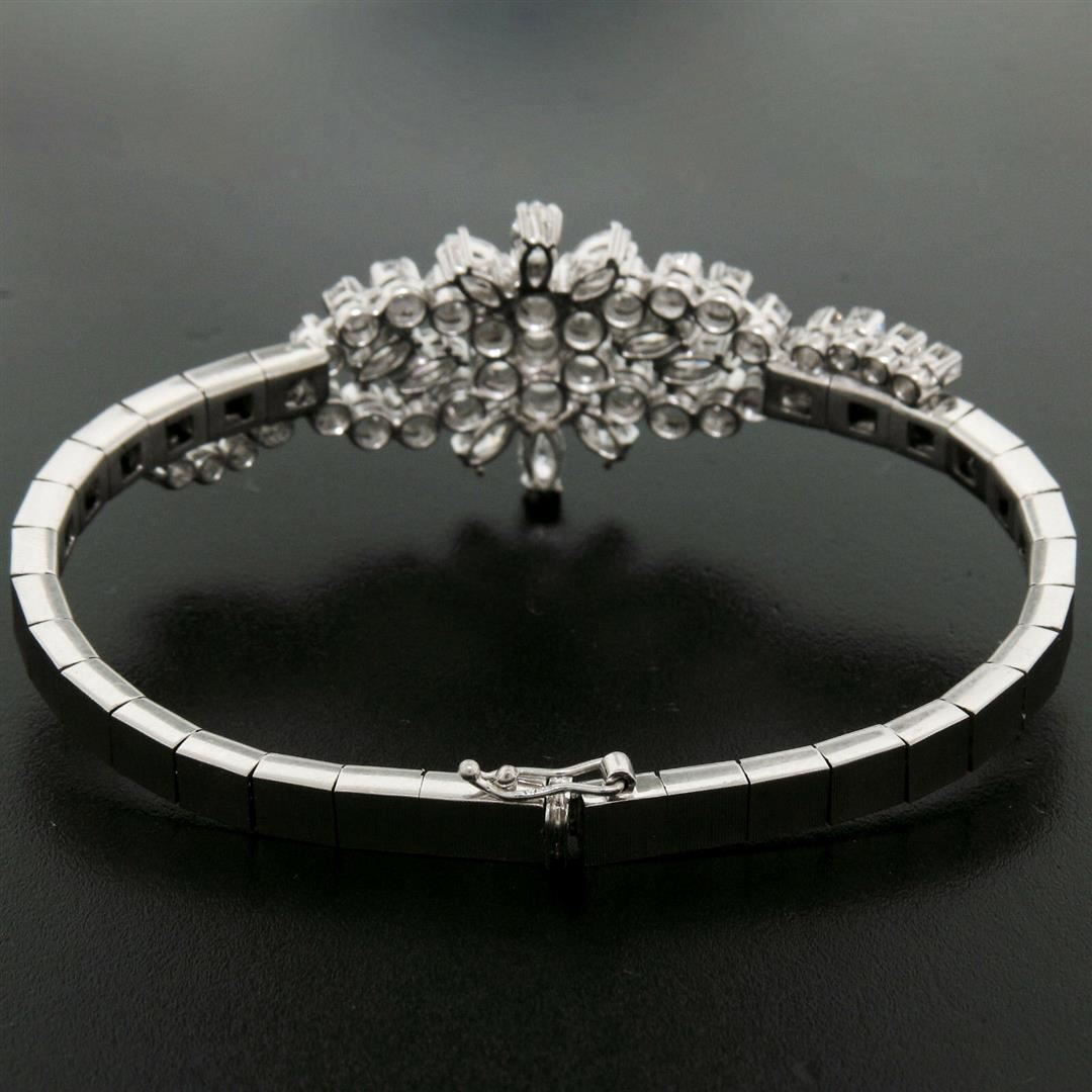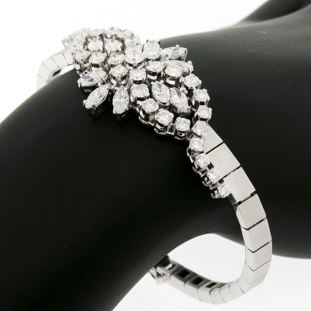 One Vintage 18K White Gold 5.26ctw Round and Marquise Diamond Textured Box Link Bracelet. Item Details: Material: 18K Solid White Gold, Weight: 23.39 Grams, Stone(s): (33) Natural Genuine Diamonds - Round Brilliant Cut - Prong Set - F/G Color - VS1 Clarity - 3.16ctw (approx.), (10) Natural Genuine Diamonds - Marquise Cut - Prong Set - F/G Color - VS1 Clarity - 2.10ctw (approx.), Total Carat Weight: 5.26 (approx.), Chain Type: Textured Box Link, Chain Length: 7 Inches, Clasp: Push Clasp w/ Safety Latch. Width: 22.62mm (diamond cluster), 4.4mm (box links). Thickness: 7.85mm rise off the wrist. Condition: Vintage bracelet. Mint condition!