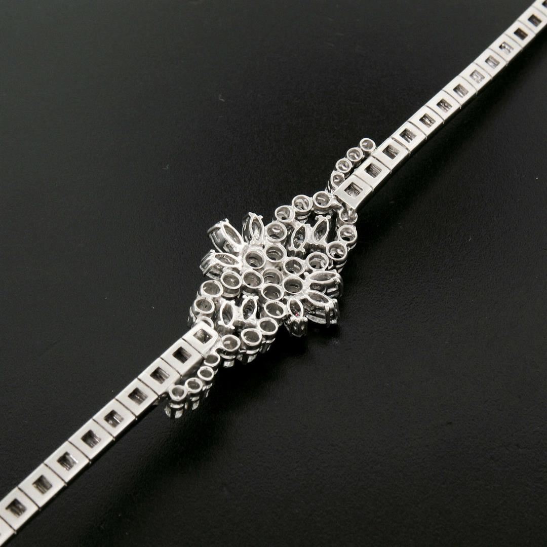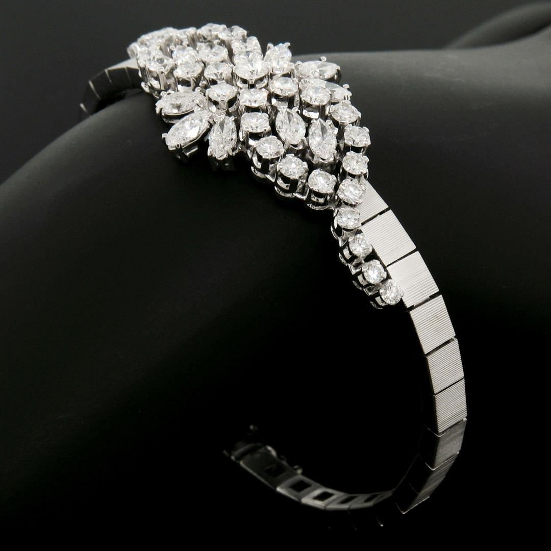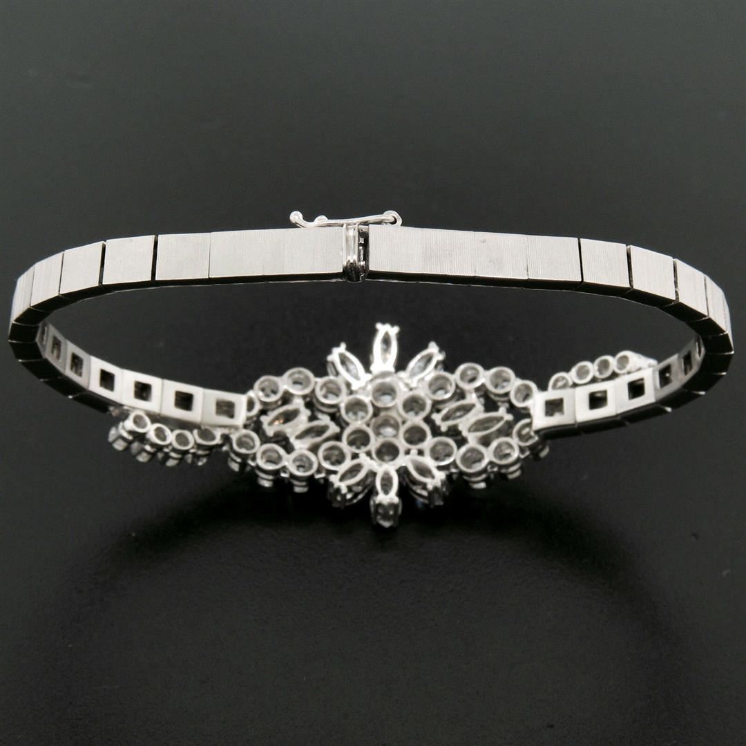 One Vintage 18K White Gold 5.26ctw Round and Marquise Diamond Textured Box Link Bracelet. Item Details: Material: 18K Solid White Gold, Weight: 23.39 Grams, Stone(s): (33) Natural Genuine Diamonds - Round Brilliant Cut - Prong Set - F/G Color - VS1 Clarity - 3.16ctw (approx.), (10) Natural Genuine Diamonds - Marquise Cut - Prong Set - F/G Color - VS1 Clarity - 2.10ctw (approx.), Total Carat Weight: 5.26 (approx.), Chain Type: Textured Box Link, Chain Length: 7 Inches, Clasp: Push Clasp w/ Safety Latch. Width: 22.62mm (diamond cluster), 4.4mm (box links). Thickness: 7.85mm rise off the wrist. Condition: Vintage bracelet. Mint condition!