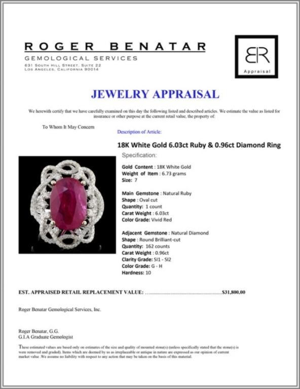 Regarding Appraised Jewelry and Loose Stones - Auctionfarm sends them out to a third party for Retail Replacement Value Appraisals, which are the most common. These types of evaluations are written for insurance needs. This would be the cost to replace the jewelry with an item of equal quality and kind, considered to be the current market price or the replacement value. This type of appraisal is done to protect you in the event of damage or loss of a valuable item. Our appraisals are conducted by independent 3rd Party appraisal firms that utilizes Certified GIA Gemologist. Appraisals should be used for verification of gemstone and/or metal weight, size, and grade only, not actual value. Appraisal value should be considered for insurance purposes only, not actual value, as price varies greatly from retail locations thru out the world. Items should not be purchased with the expectation to resell for appraisal price, or for profit.