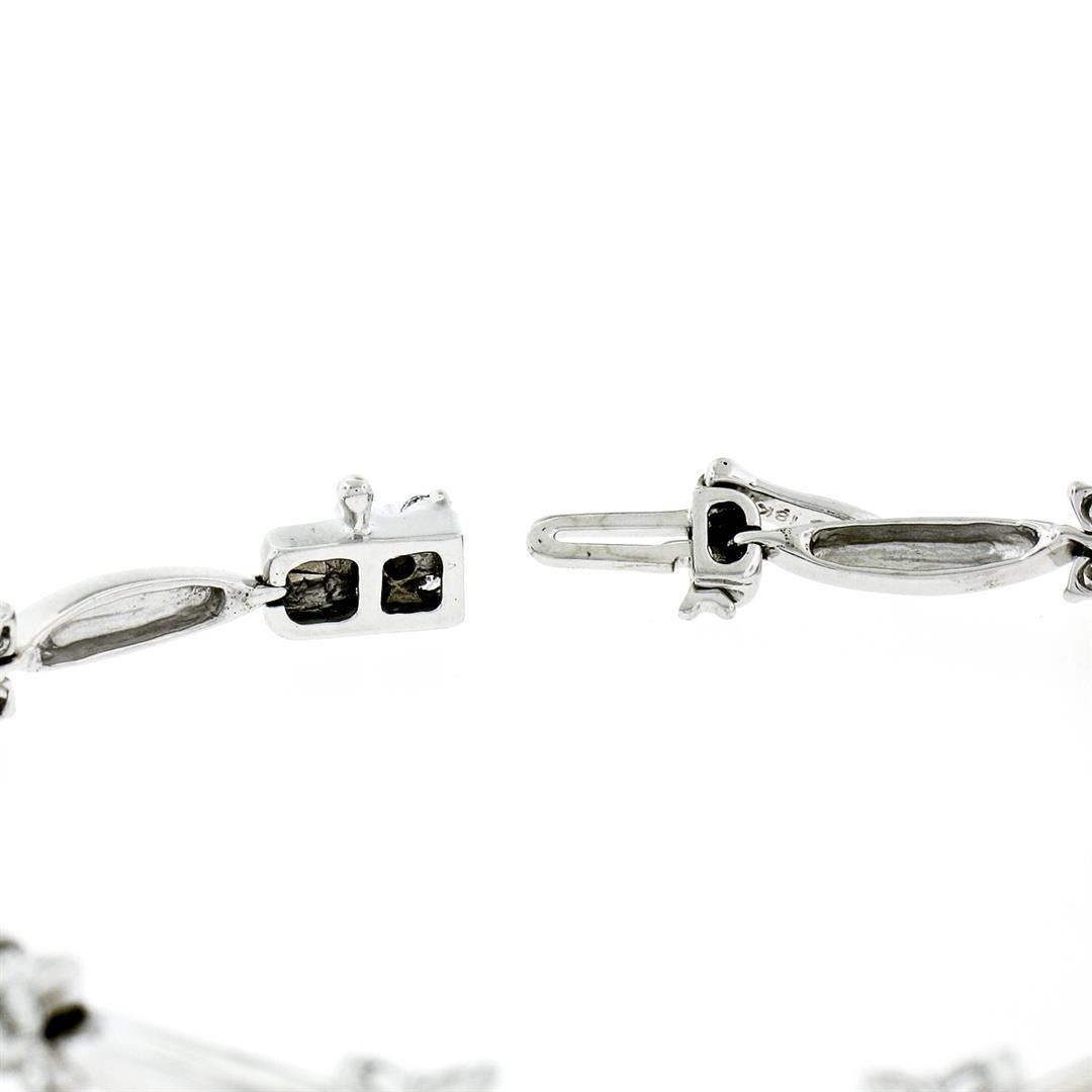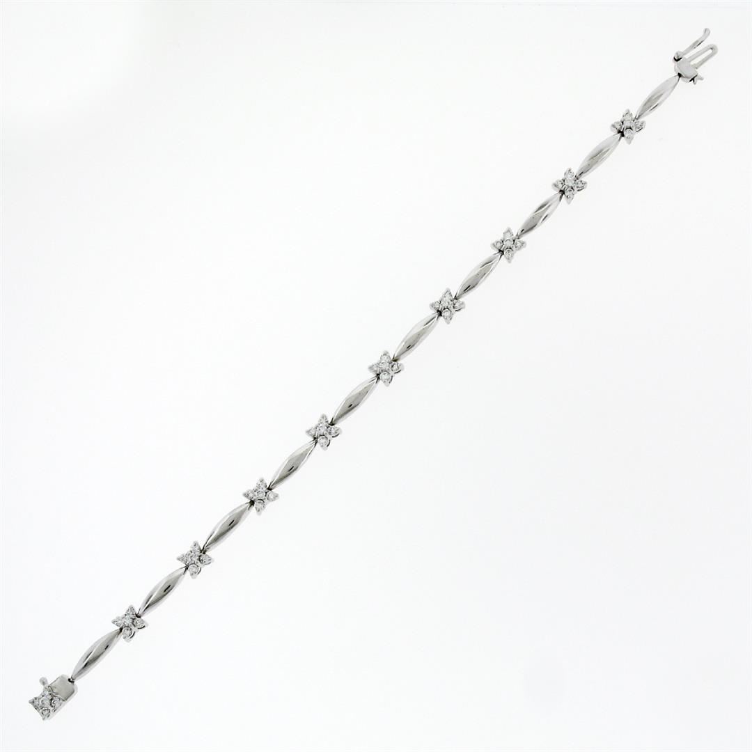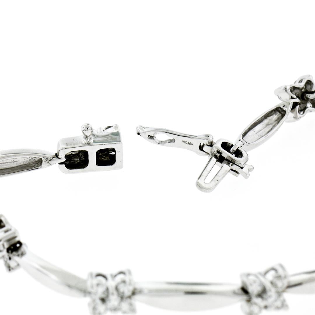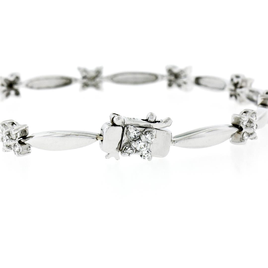 An estate solid 18k white gold bar link bracelet, with 50 round brilliant cut natural diamonds (F/G- VS1/VS2; 1.50ctw). It weighs a total of 11.47 grams, measures 5.30mm wide, and measures 7 inches in length.