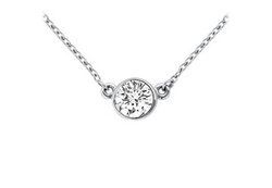 A round diamond is delicately suspended in a rich 18K white gold bezel-setting. This diamond solitaire pendant has a total weight (TDW) of 0.33 ct and comes with a standard 16 14K gold chain.