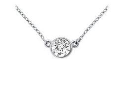 A round diamond is delicately suspended in a rich 18K white gold bezel-setting. This diamond solitaire pendant has a total weight (TDW) of 0.50 ct and comes with a standard 16 14K gold chain.