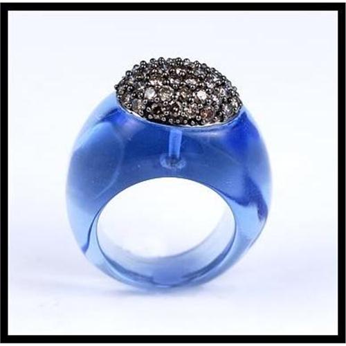 This trendy translucent blue crystal ring has a European style. 47 full cut; natural brown diamonds are centered in the ring and weigh approximately 2.97 carats TW. The ring is size 6-1/2 and measures 12mm (1/2 inches) x 16mm (5/8 inches).