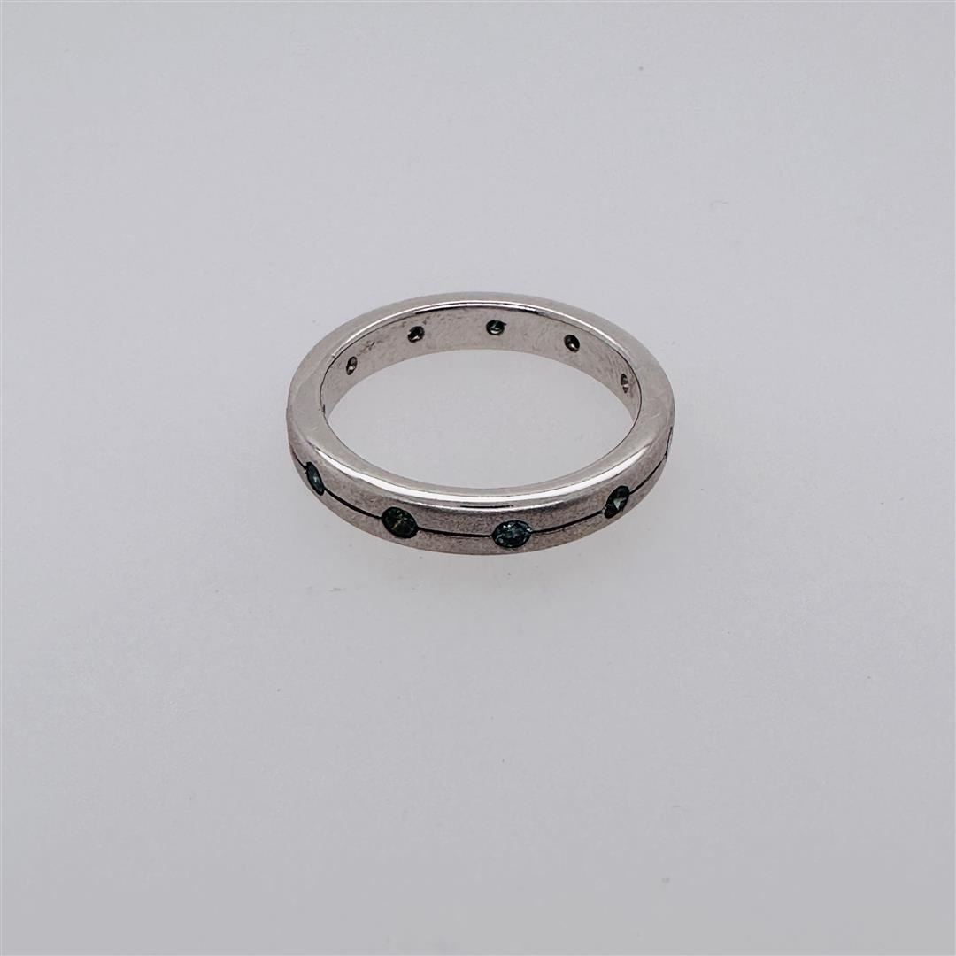 A handmade gentleman's 18k white gold dress band spaced with blue diamonds which have been custom color enhanced; the narrow band with engraved center line and unblemished satin ground, marked 750; designed by Victor Loo; 9.3 g, size 10 3/4.