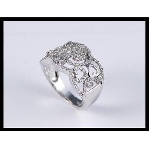 An intricate filigree design makes this ring superior to others. 12 full cut shimmering diamonds and 110 square cut diamonds weighing .54 carats TW are set in 18K white gold. The ring is a size 6-1/2 and measures 13 millimeters (1/2 inches) wide.