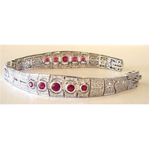 Circa. 1975 America. Extraordinary diamond and ruby bracelet. If this bracelet was truly made during the Art-Deco period, it would be sold for $20,000.00. However, it is Deco-style, made in the 1970's. 18K white gold tested with 18K acid. All 10 rubies tested with refractive index liquid. All diamonds tested with a diamond tester. There are 297 diamonds. The total diamond weight is approximately 5.25 carats. The total ruby weight is approximately 3.50 carats. The bracelet is 7 inches long and almost 1/2 inch wide at its widest. The rubies are pidgeon blood, a most desireable and attractive red. 35.1 gr. 22.6 dwt. In excellent condition.